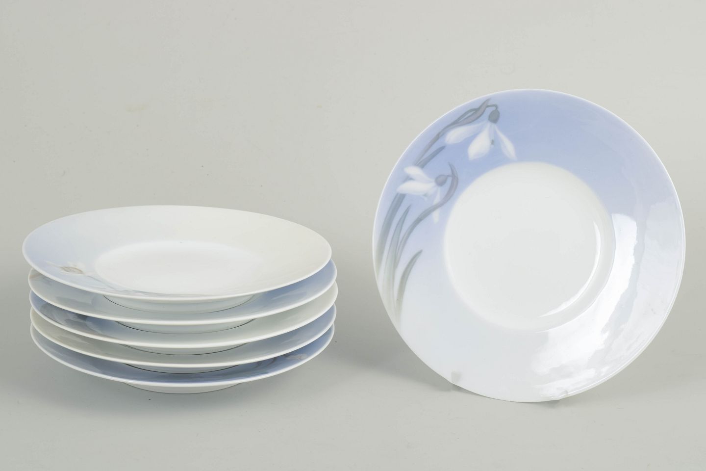 Sæt bestående af seks tallerkener i glaseret porcelæn med håndmalet underglasurdekoration i Art Nouveau-stil med stiliserede blomster- og bladmotor i afdæmpede blå og grønne nuancer. Udført efter Royal Copenhagens model 12/1910. Eksemplarerne er annullerede og mærket med én indridsede streg under bunden.