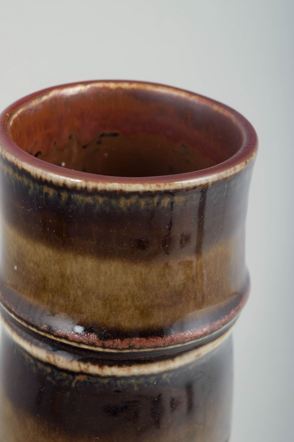 Slank, cylindrisk vase i stentøj med markant lodret formopbygning og let profilerede ringe. Overfladen er dækket af levende, løbende glasurer i varme brune, ravfarvede og beige nuancer med tydelig dybde og variation, karakteristisk for Rörstrands kunstneriske stentøjsproduktion i 1970’erne.