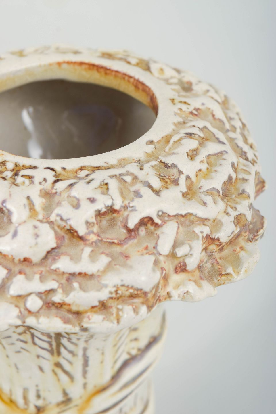 Kraftfuldt formet vase i stentøj med markant reliefdekoration og kraftig, løbende glasur i cremefarvede og brune nuancer. Overfladen har et tydeligt, næsten barklignende udtryk, der understreger det skulpturelle formsprog. Signeret “KB” i bunden. Udført hos Höganäs Keramik og dateret til omkring 1960’erne.