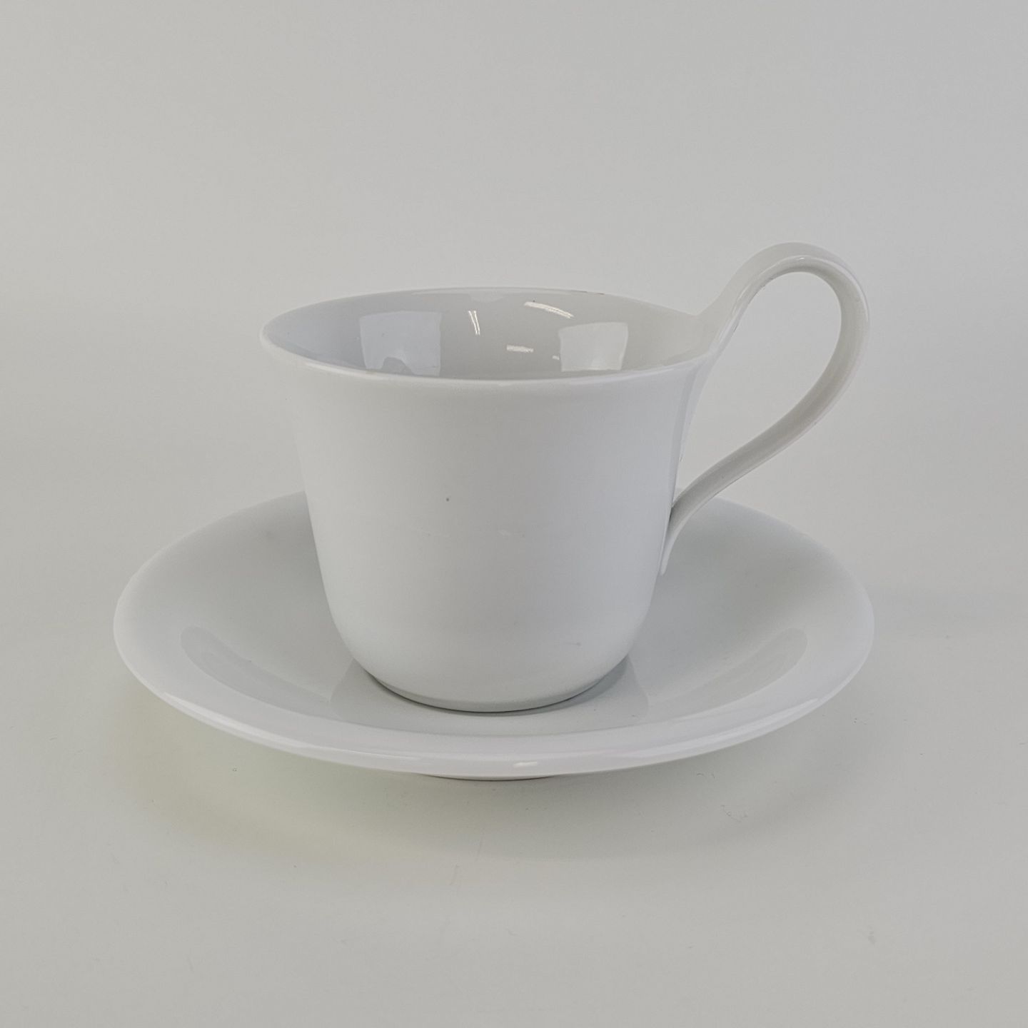Kop med høj hank og underkop i glat hvidt porcelæn