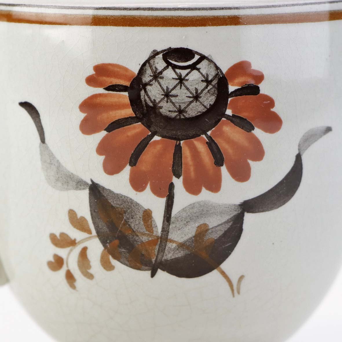 Fajancestellet er i stelformen Viktoria II med dekoration af orangebrune blomster på gråtonet baggrund med brun kant.