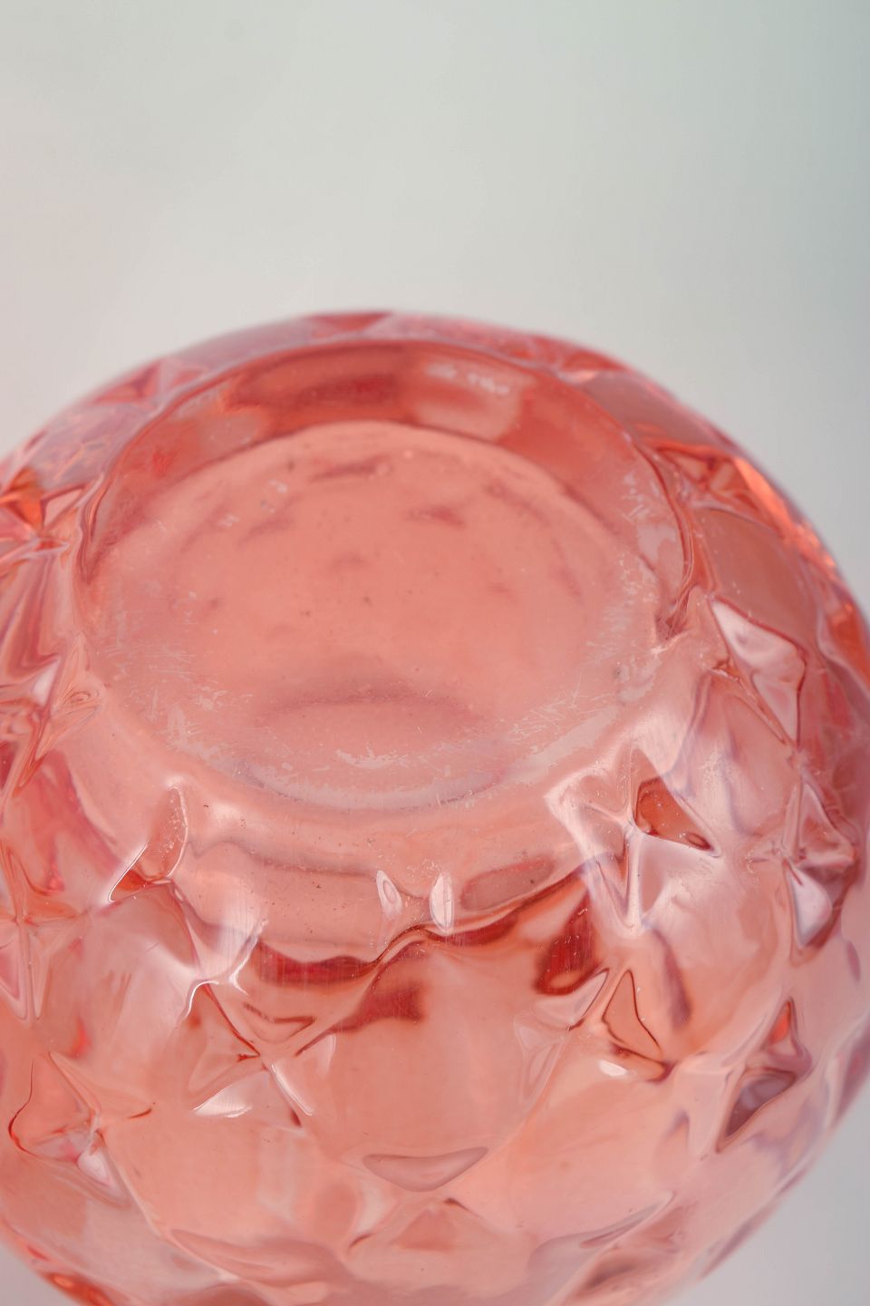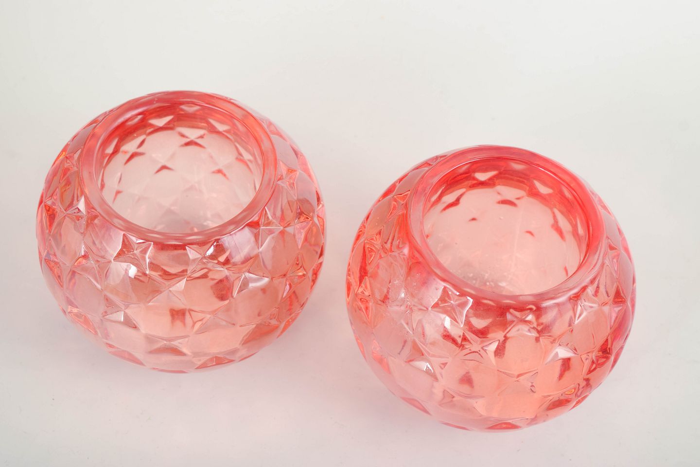Et par kugleformede fyrfadsstager i presset glas med en facetslebet, geometrisk overflade og transparent rosa farvetone. Den skulpturelle, juvellignende form forstærker lysets spil, når de er tændt, og er karakteristisk for Kjell Engmans ekspressive tilgang til svensk studioglas og kunstglas i slutningen af det 20. århundrede.