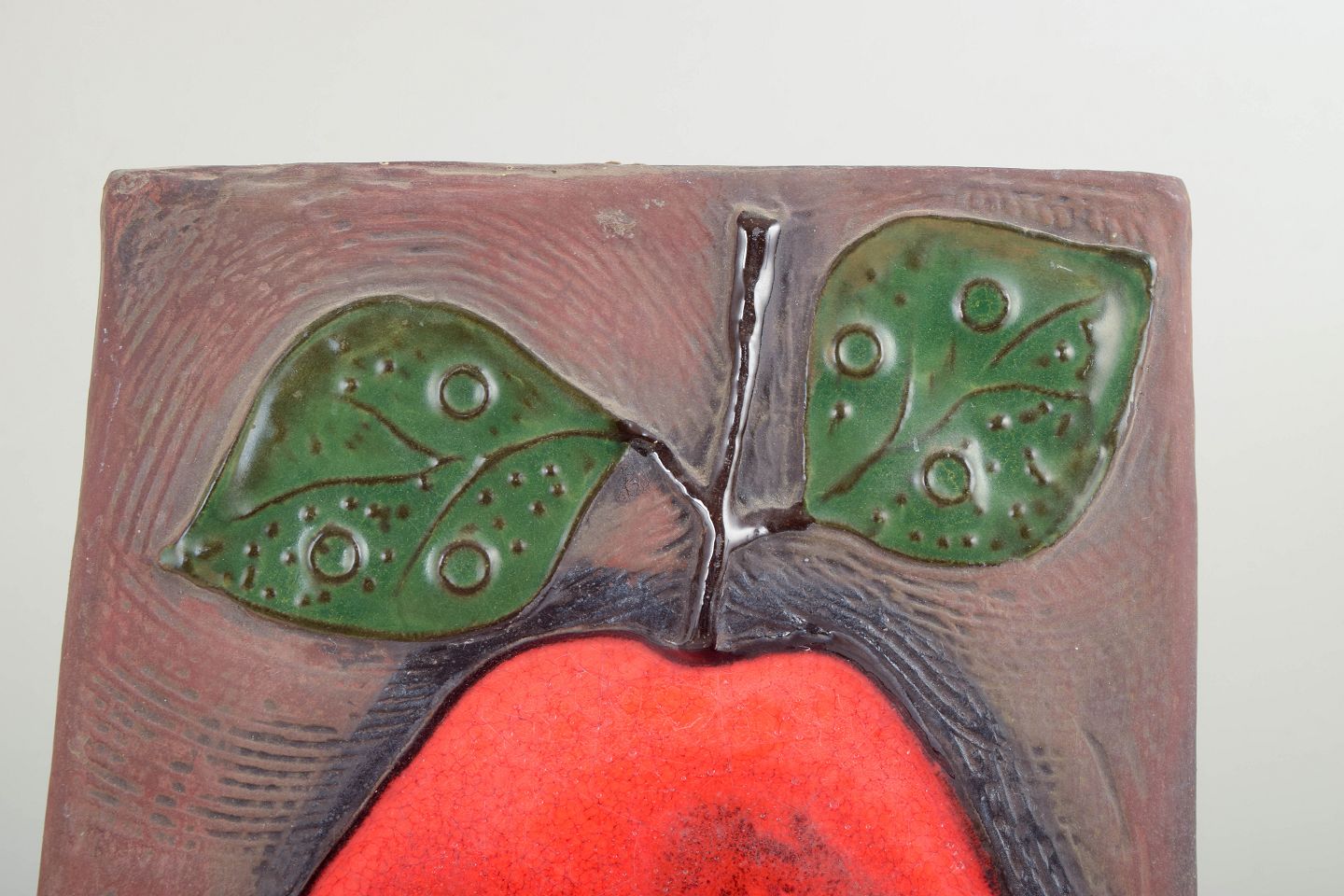 Stort, sjældent vægrelief i glaseret keramik med stiliseret frugtmotiv. Relieffet er domineret af et markant rødt frugtfelt med grønne blade mod en brunlig, struktureret baggrund, der understreger motivets plastiske virkning. Glasurerne er kraftfulde og levende og giver relieffet et tydeligt kunstnerisk og modernistisk udtryk. Modelnummer 1043E.