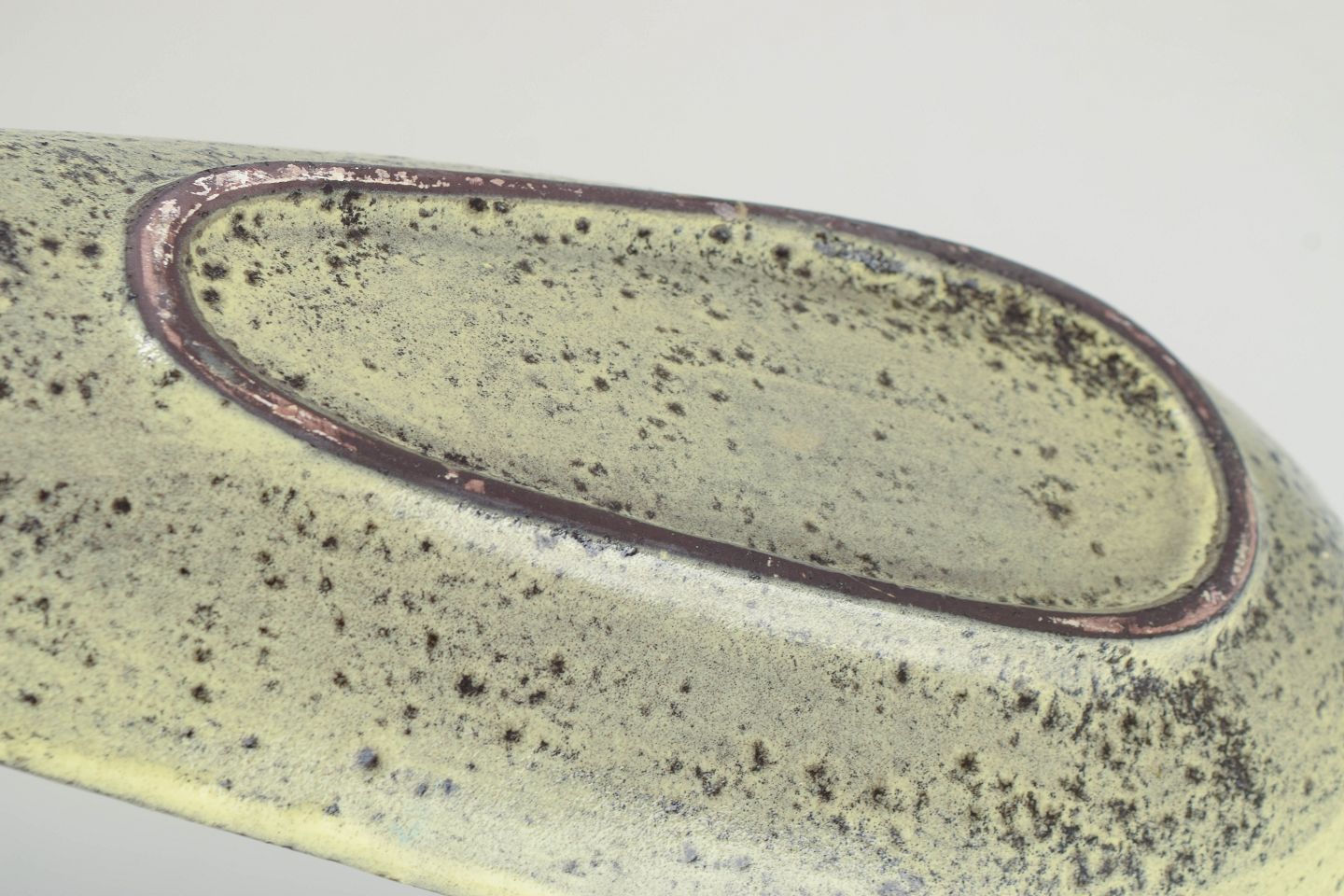 Stor, organisk oval skål i glaseret keramik med abstrakt, hånddekoreret mønster i blå, gule og mørke toner med karakteristisk plettet effekt i glasuren.