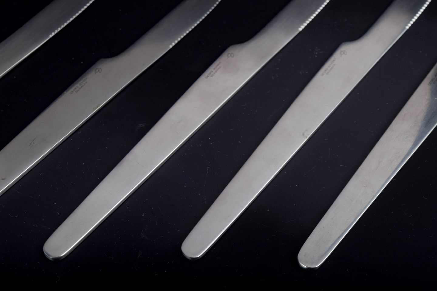 Sæt bestående af fem middagsknive i rustfrit stål. Knivene er udført i et stramt og funktionelt formsprog karakteristisk for Arne Jacobsens bestikdesign og produceret af Georg Jensen. Modellen er fra 1980’erne.