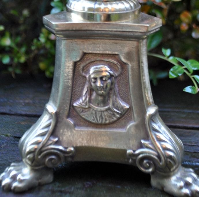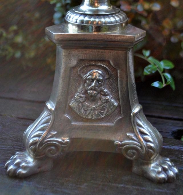 French brass church candlestick, 19th century. On a triangular base with lion's feet with a motif of Jesus, the Virgin Mary and burning hearts. Stamped: LF a Paris. H: 46 cm. W: 12.5 cm.