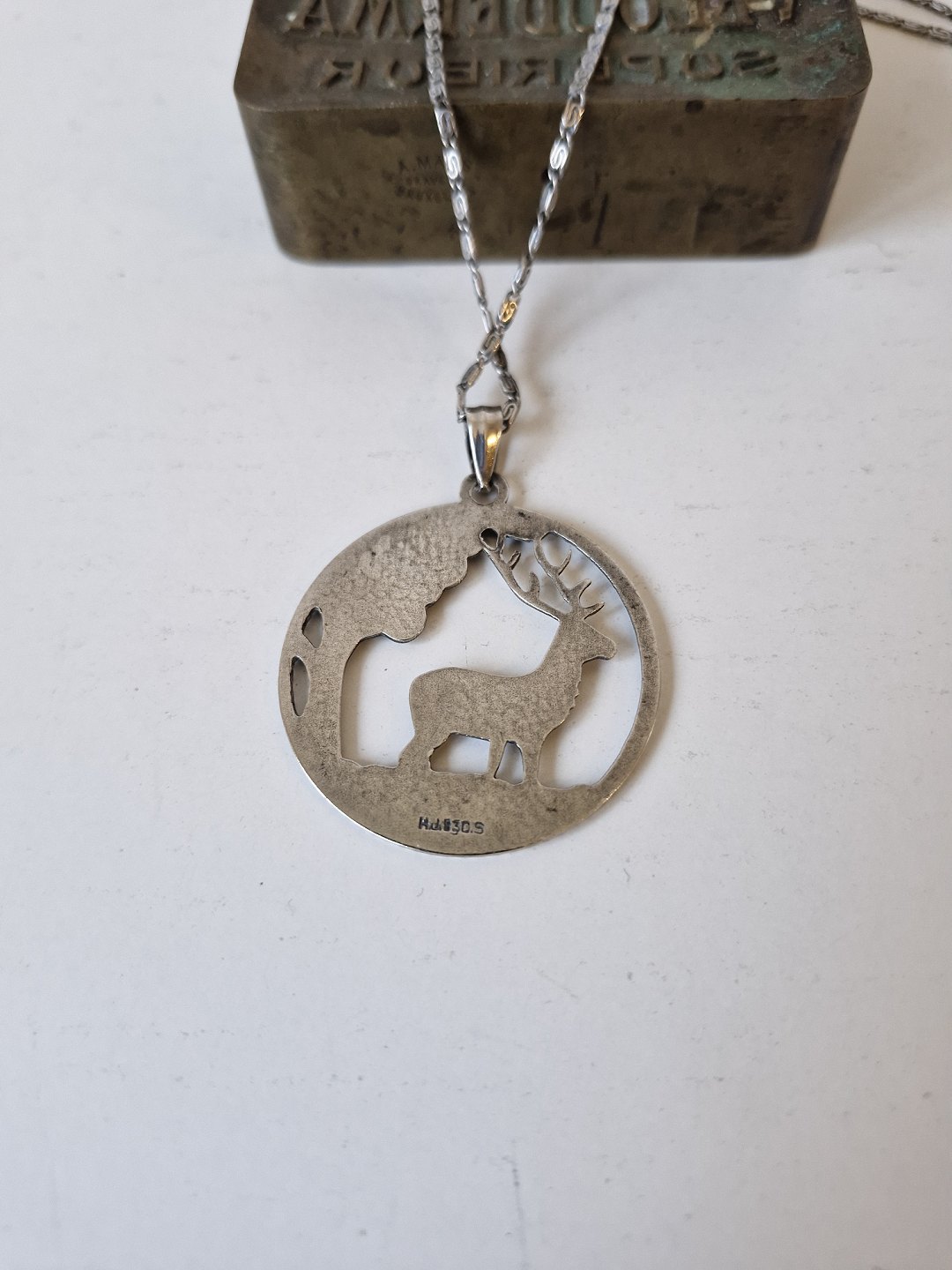 Halskæde og vedhæng i sølv, vedhænget er udformet som skovparti med krondyr