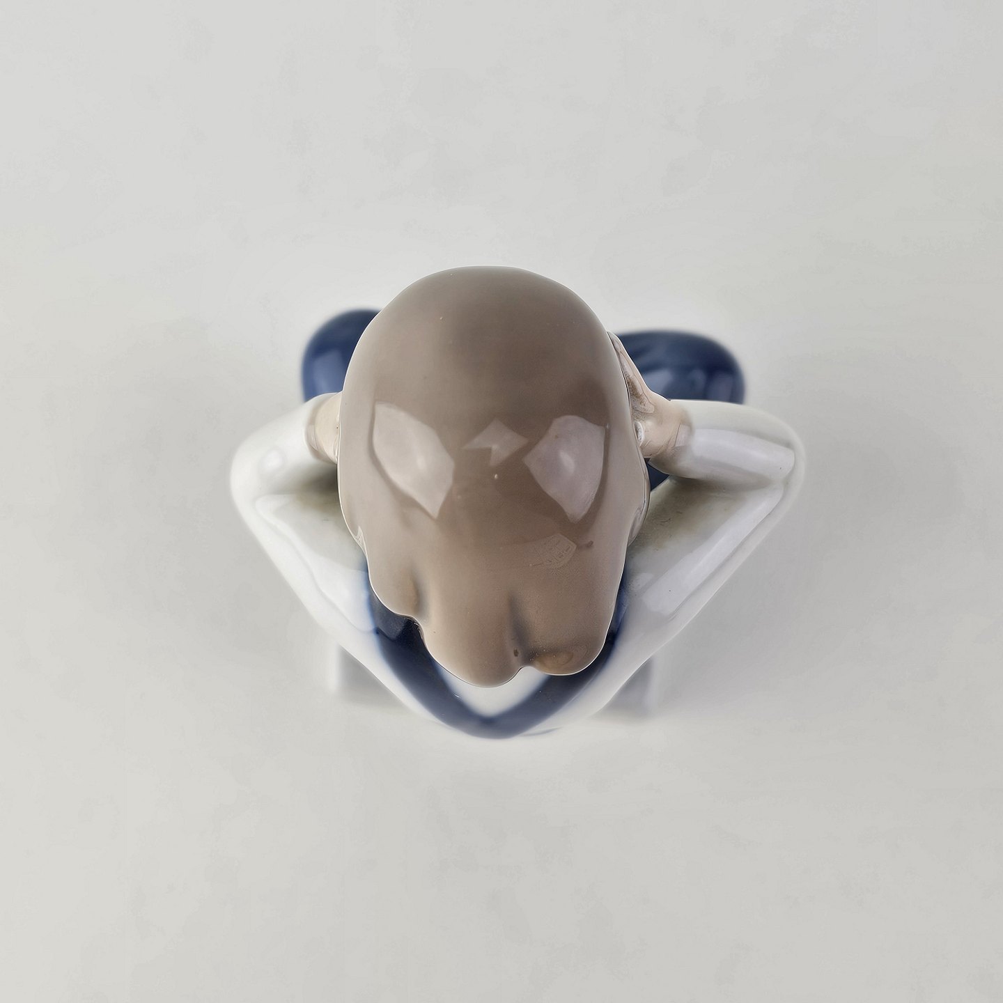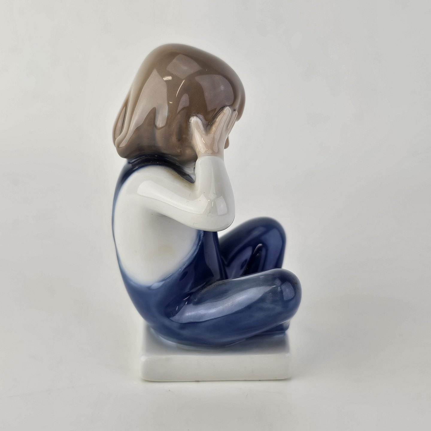 Figur i kongeligt porcelæn med motiv af en dreng, som sidder med benene over kors og holder sig for øjnene