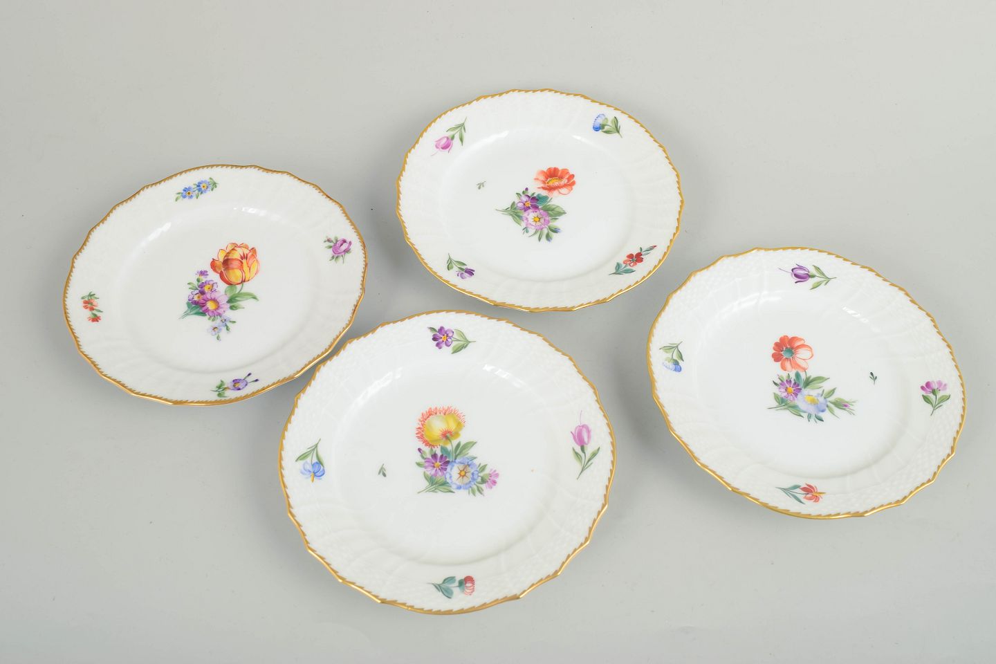 Sæt med fire kagetallerkener i hvidglaseret porcelæn med håndmalet blomsterdekoration i serien let Saksisk Blomst og forgyldt kant; model 493/1627.