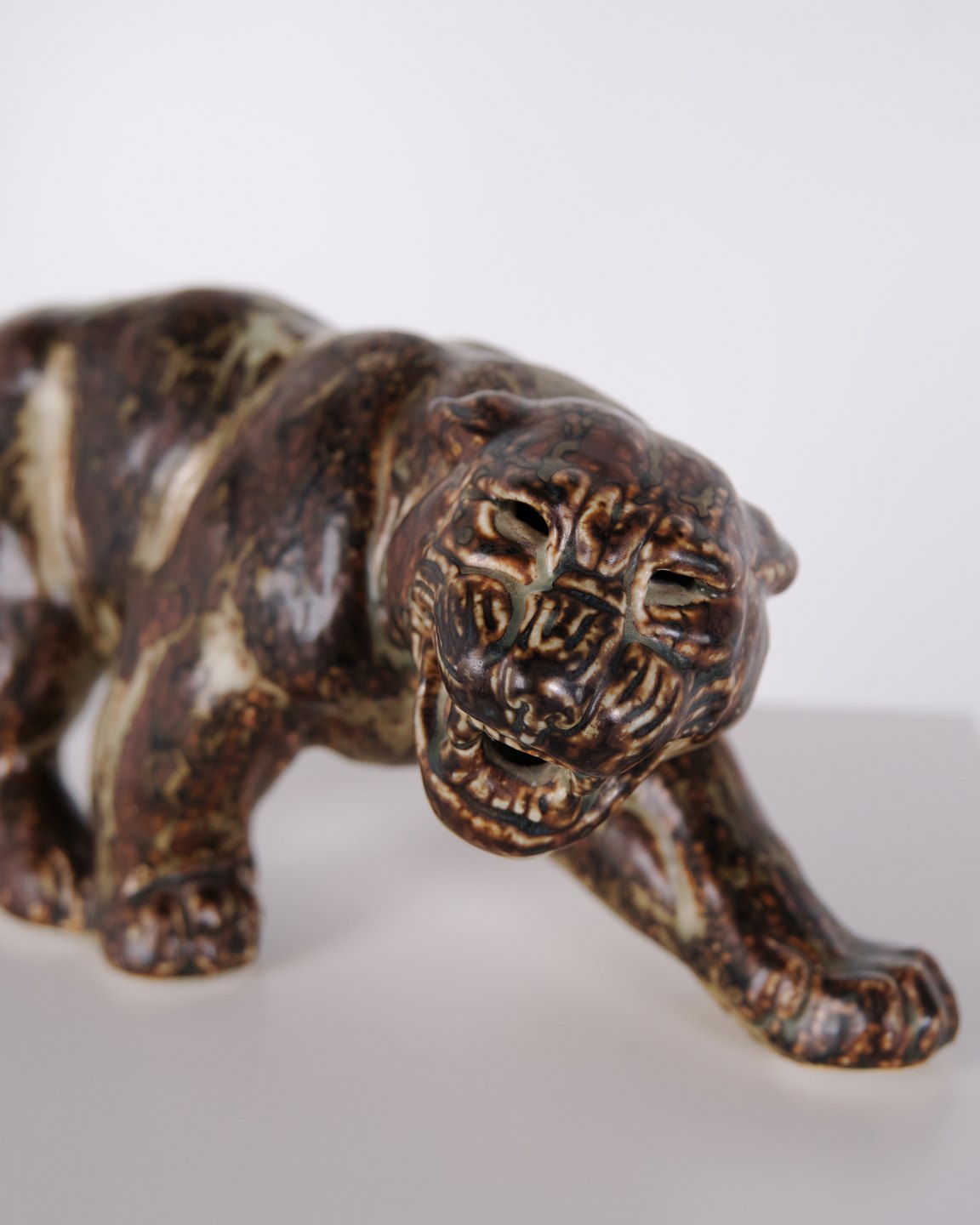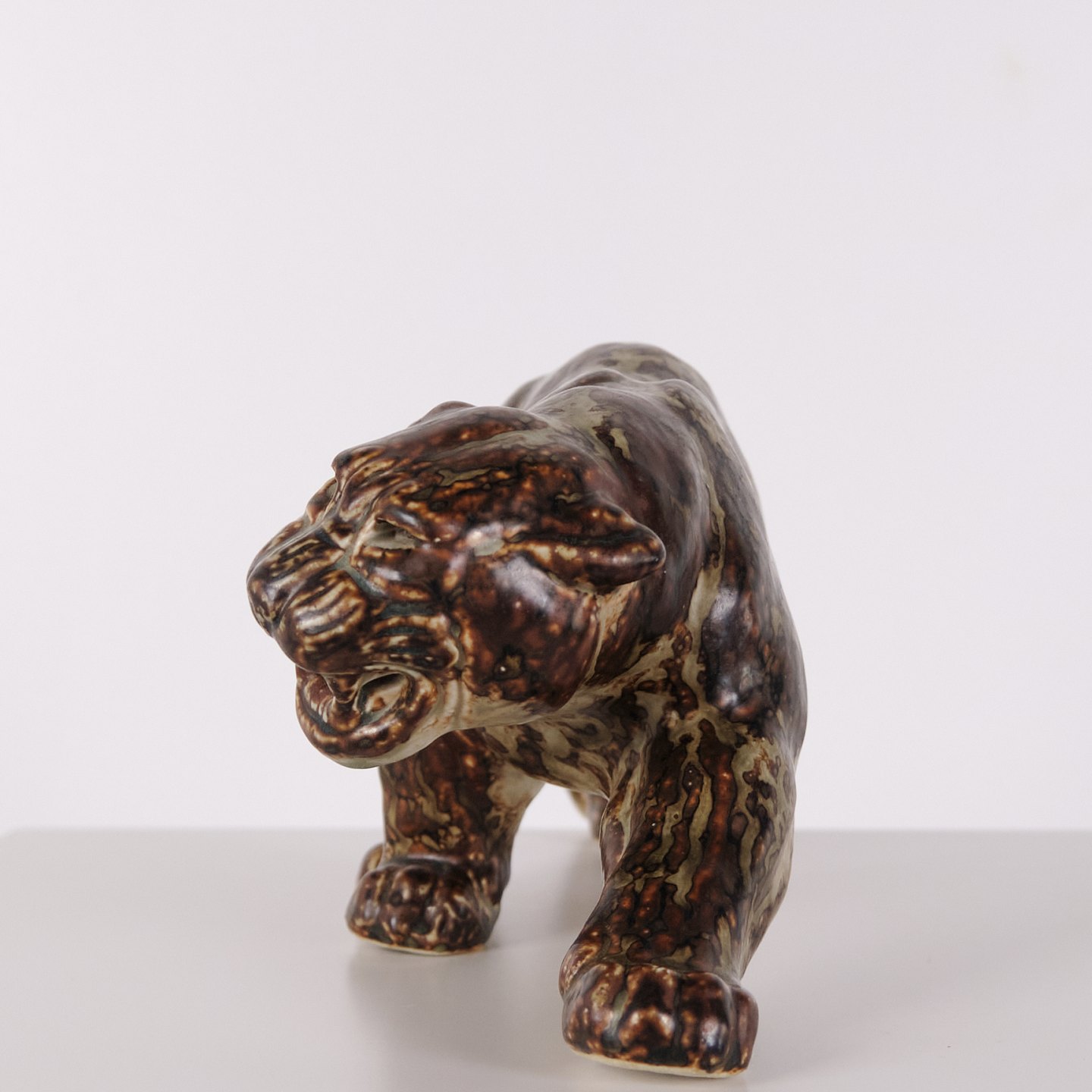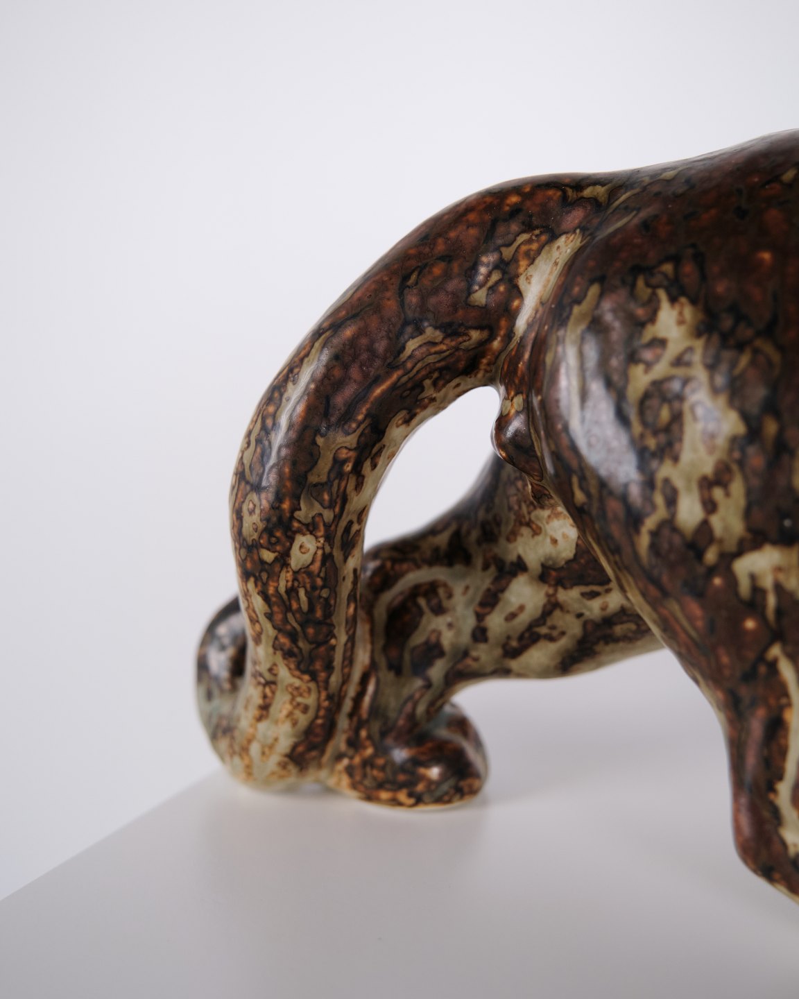 Steinzeugfigur mit Panthermotiv, Modell 20283, entworfen von Knud Kyhn für Royal Copenhagen. Die Figur wurde aus Steinzeug gefertigt und gehört zu Knud Kyhns Tierdarstellungen, die bei Royal Copenhagen produziert wurden und dem dänischen Keramikdesign des 20. Jahrhunderts zuzuordnen sind.