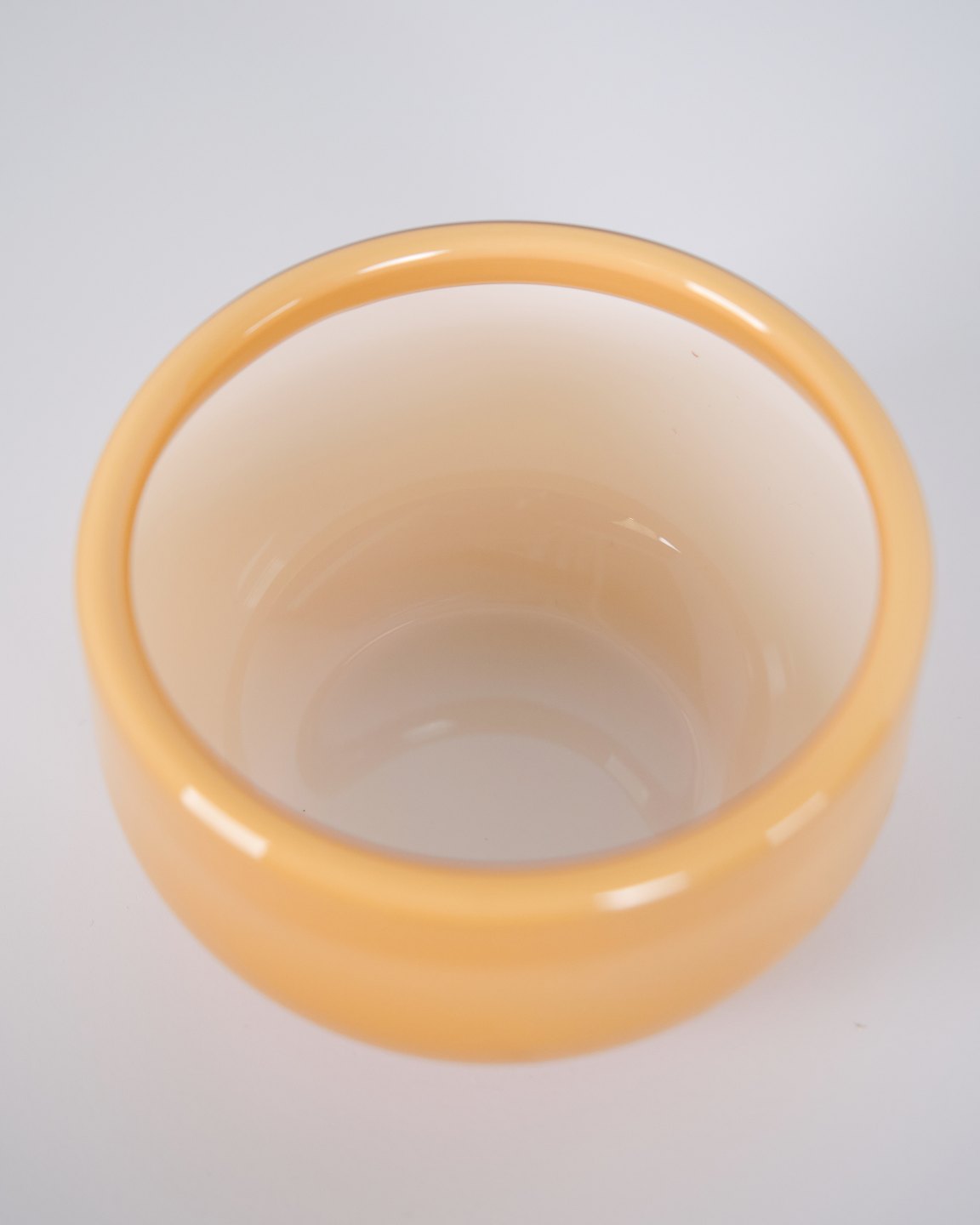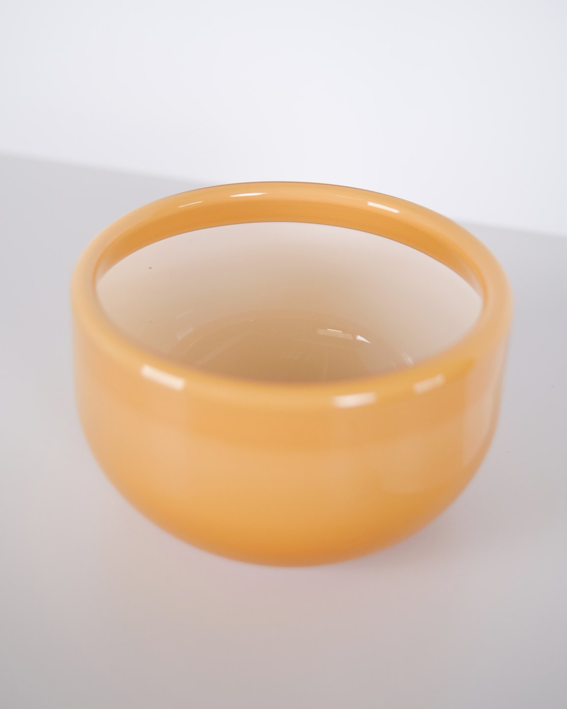 Glasskål fra Palet-serien designet af Michael Bang for Holmegaard. Skålen er udført i mundblæst glas i gul/karamel farvetone, kendetegnet ved Palet-seriens farvearbejde og enkle, funktionelle formsprog. Serien blev produceret hos Holmegaard i anden halvdel af det 20. århundrede og er i dag efterspurgt inden for dansk glasdesign.