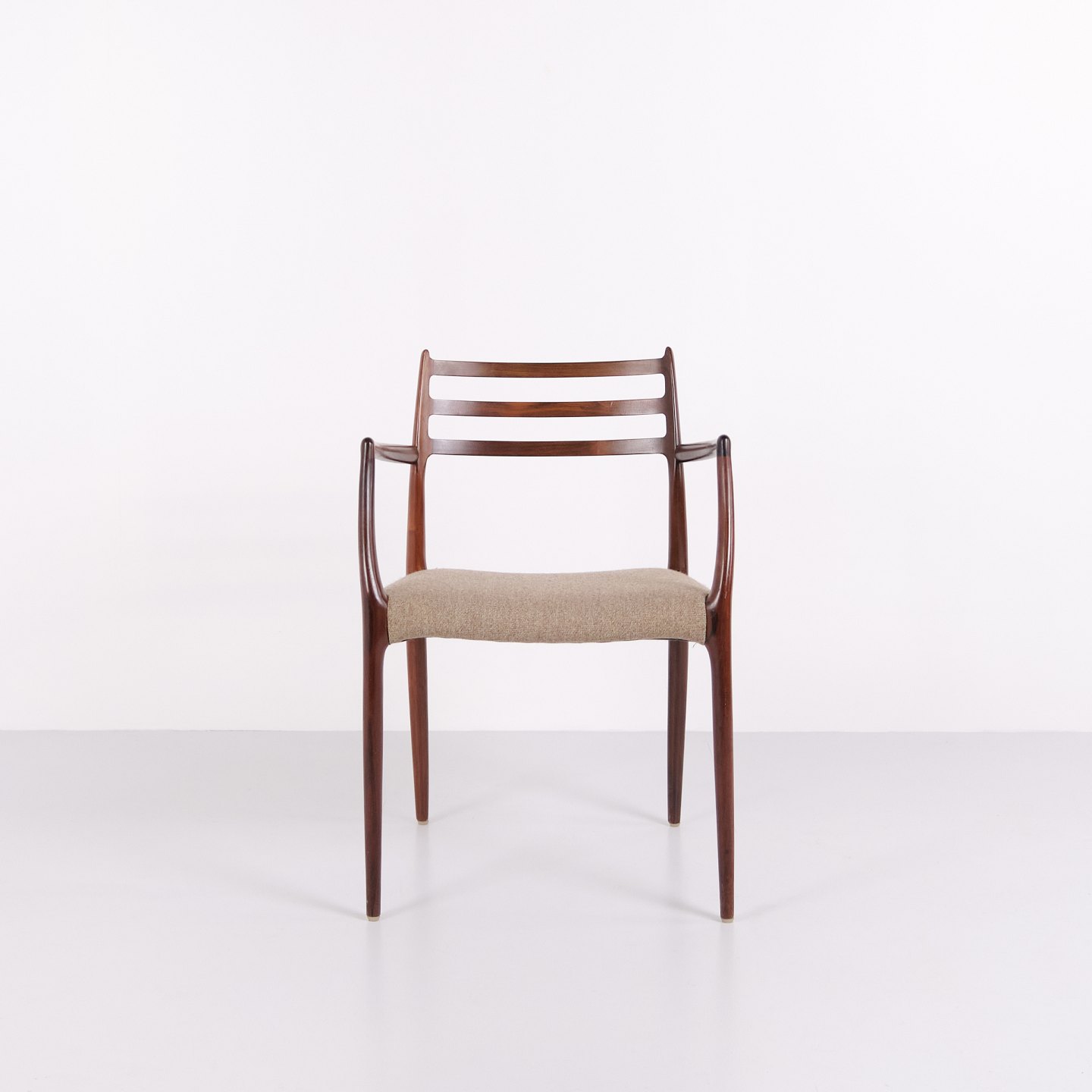 Sæt armstole, model 62, designet af Niels Otto Møller i 1962. Stolene er udført i palisander og er kendt for deres slanke konstruktion, præcise snedkerdetaljer og ergonomiske opbygning. Model 62 regnes blandt Niels Otto Møllers mest anerkendte stole og er et markant eksempel på dansk møbeldesign fra begyndelsen af 1960’erne.
