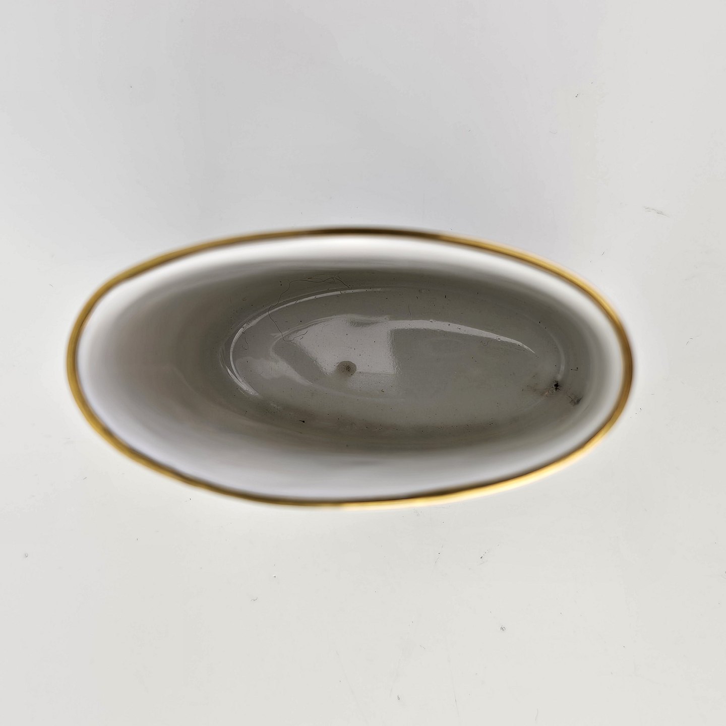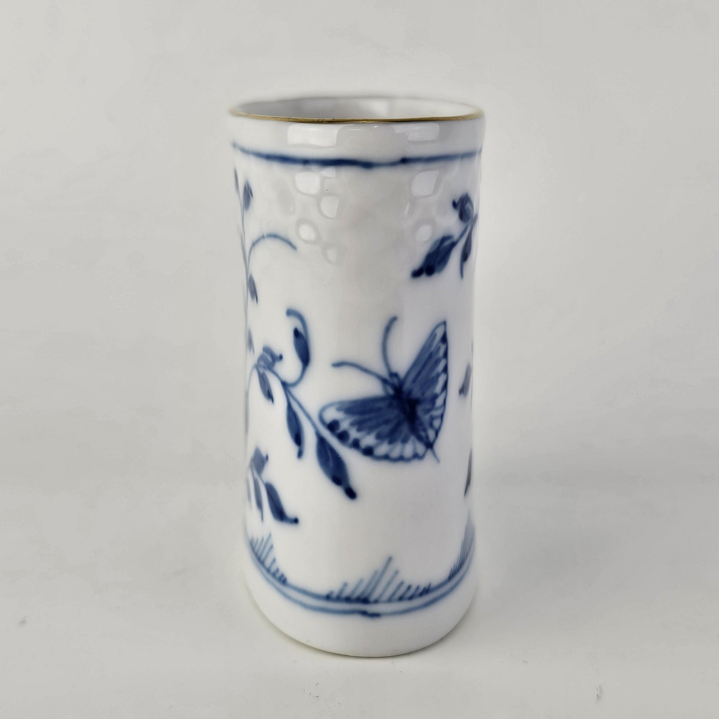 Stel i hvidt porcelæn med guldkant med blå motiver af blomster og sommerfugle.
