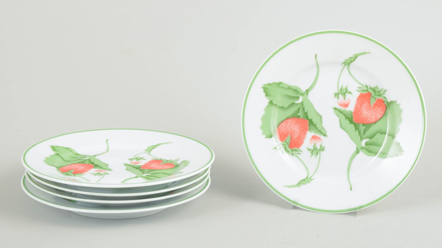 Sæt med fem mindre tallerkener i porcelæn med dekoration af jordbær og blade i serien Fraise.