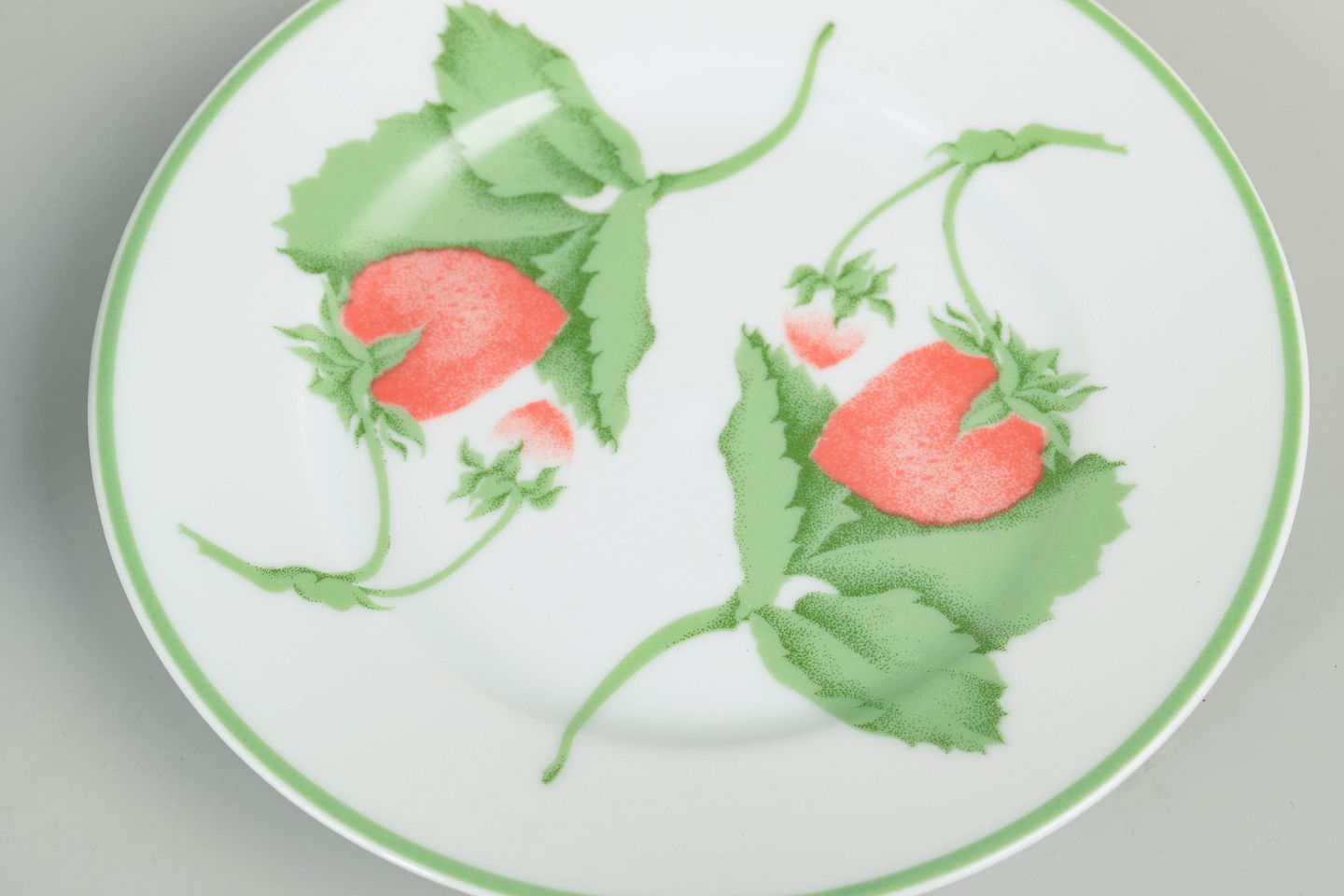 Limoges-porcelæn er kendt for sin fine kvalitet og lange tradition for dekoreret bordservice. I 1980’erne blev frugt- og blomsterdekorationer populære som et let og dekorativt udtryk til hverdags- og serveringsservice. Serien Fraise er et typisk eksempel på denne stil med sit naturalistiske motiv og enkle grønne kant.