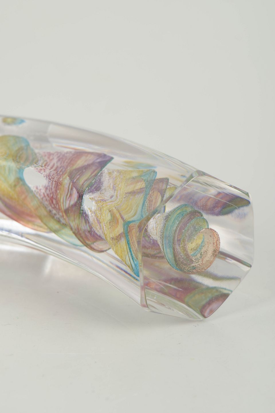 Buet skulptur i klart kunstglas med indlagte, flerfarvede, iriserende mønstre i organiske former; atelierarbejde, nummereret 80/250.