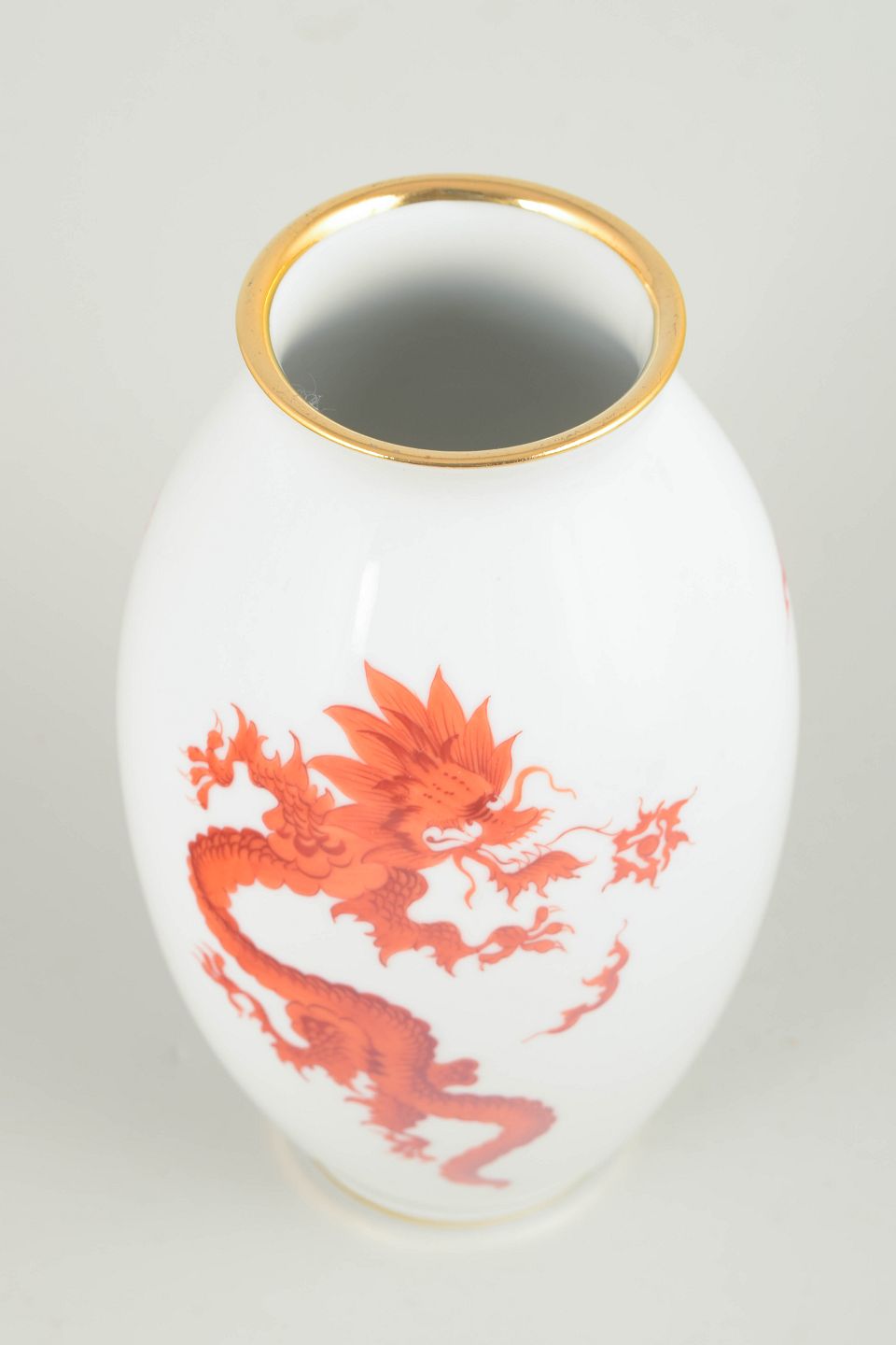 Balusterformet vase i hvidglaseret porcelæn dekoreret med rød Mingdrage og forgyldt kant. Modellen er fremstillet i Meissen-området og er ikke produceret af den kongelige Meissen-manufaktur.