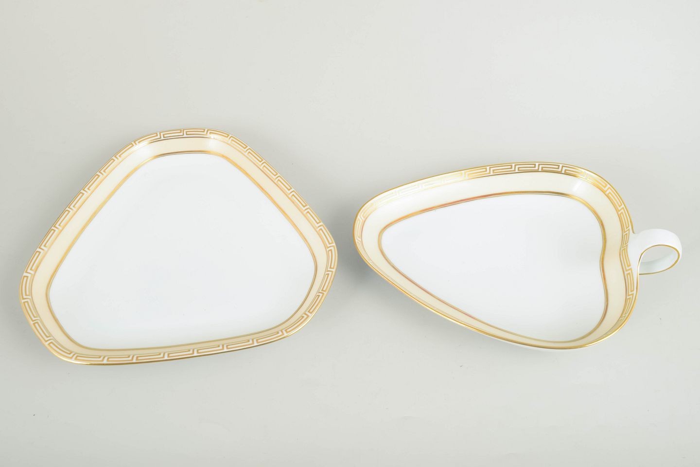 Set of two triangular dishes in white-glazed porcelain with a gilded rim and geometric Art Deco border; models 354 and 357.