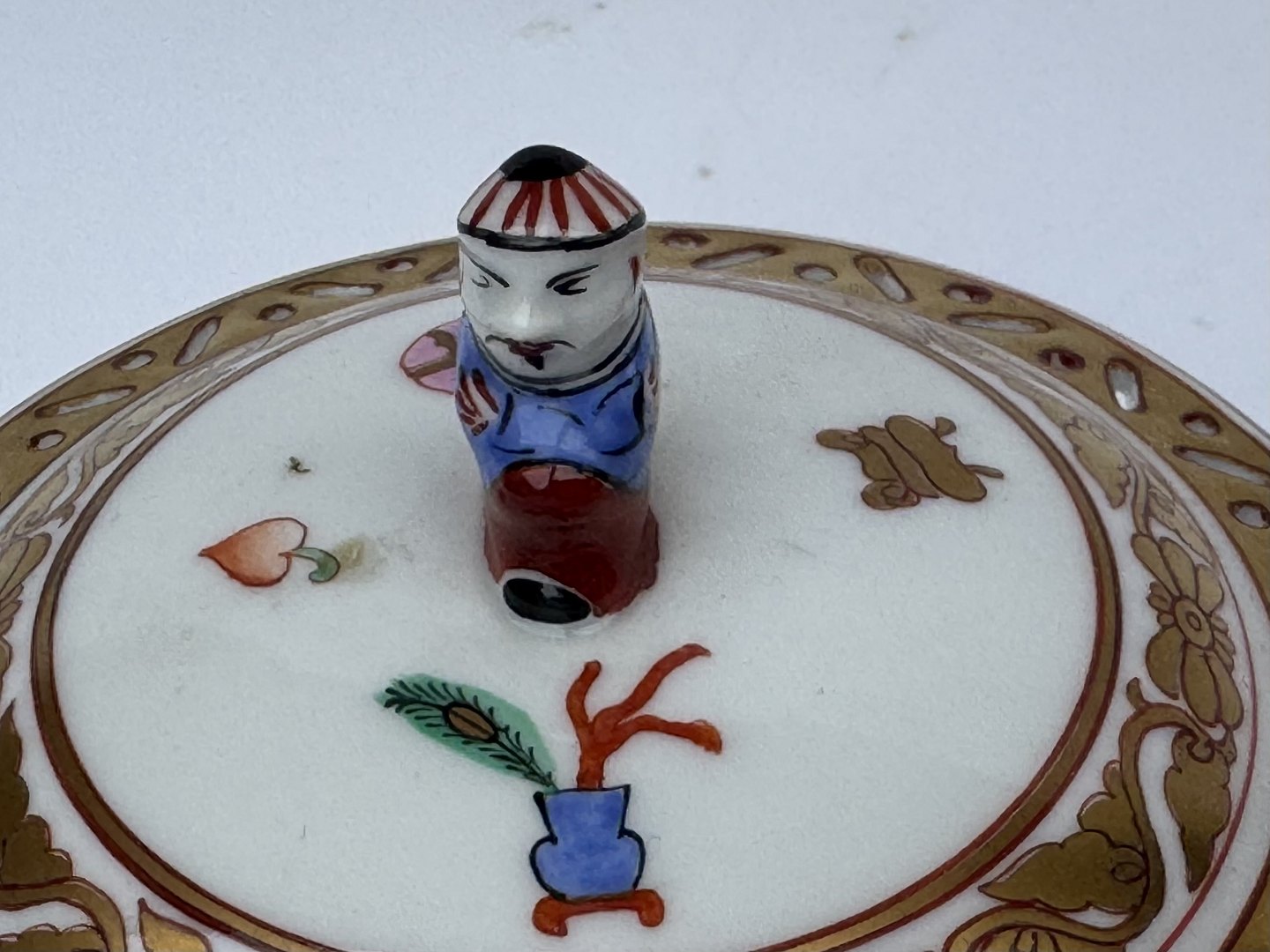 Herend lågskål i porcelæn fra Ming serien. Delikate kinesiske bemalede dekorationer samt figurer. Gennembrudte kanter. I perfekt stand. Fremstillet på den ungarnske porcelænsfabrik Herend i 1930’erne. Mål: H. 8,5 cm. Fra øre til øre 9,3 cm. Lågets diameter 8,6 cm. Bundens diameter 3,2 cm