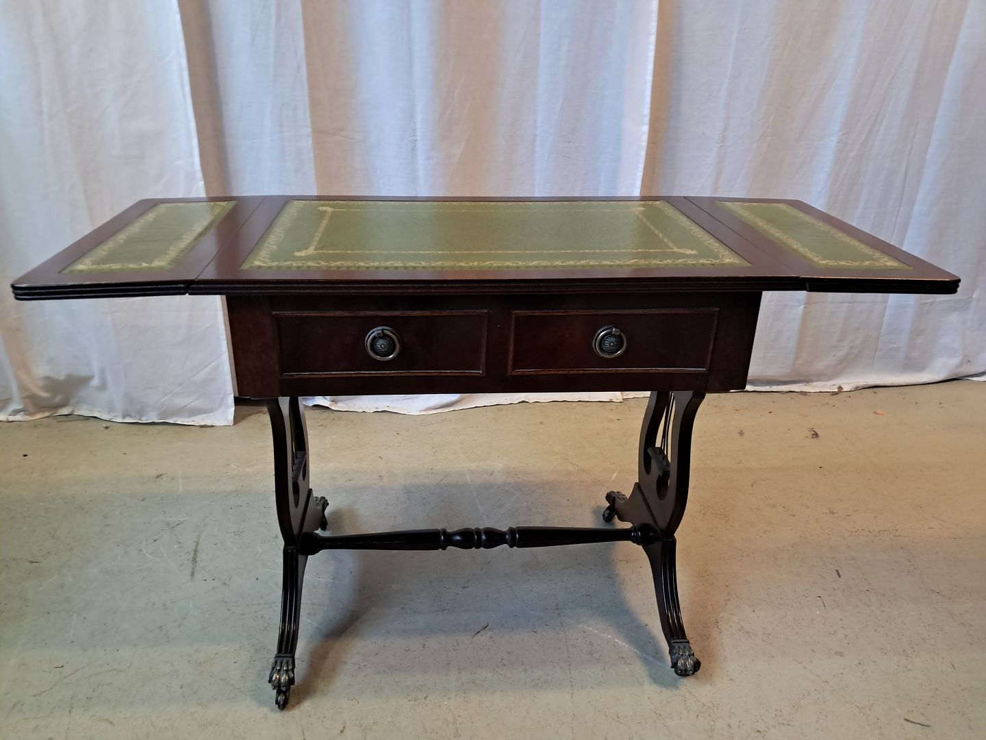 Sofabord i fineret mahogni med læderindlæg, fra 1980erne.