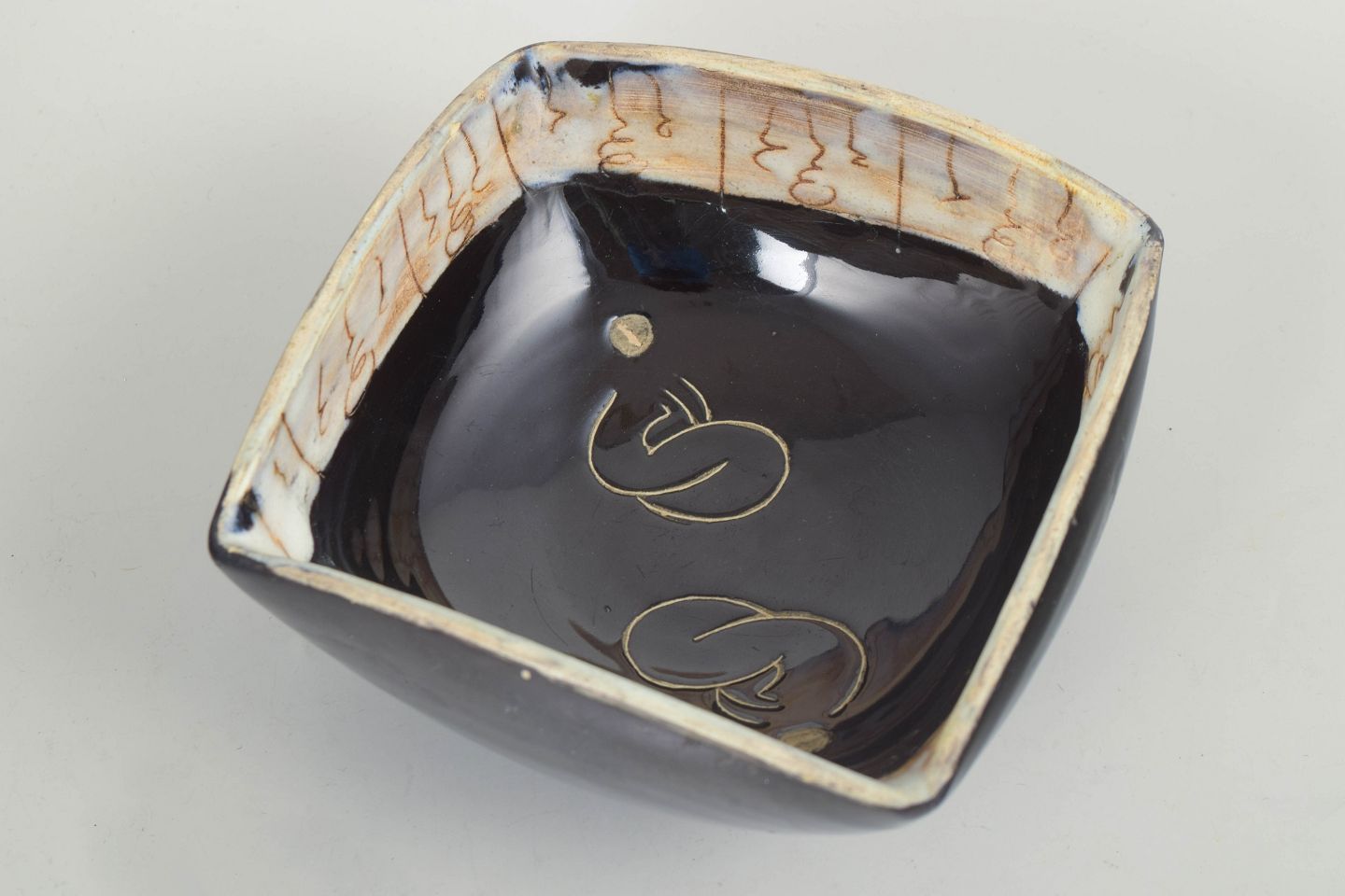 Organisk formet keramisk skål med asymmetrisk/let facetteret åbning. Mørk, blank glasur udvendigt og lys inderside med dryppede, brunlige glasurspor og fint krakeleret udtryk.
