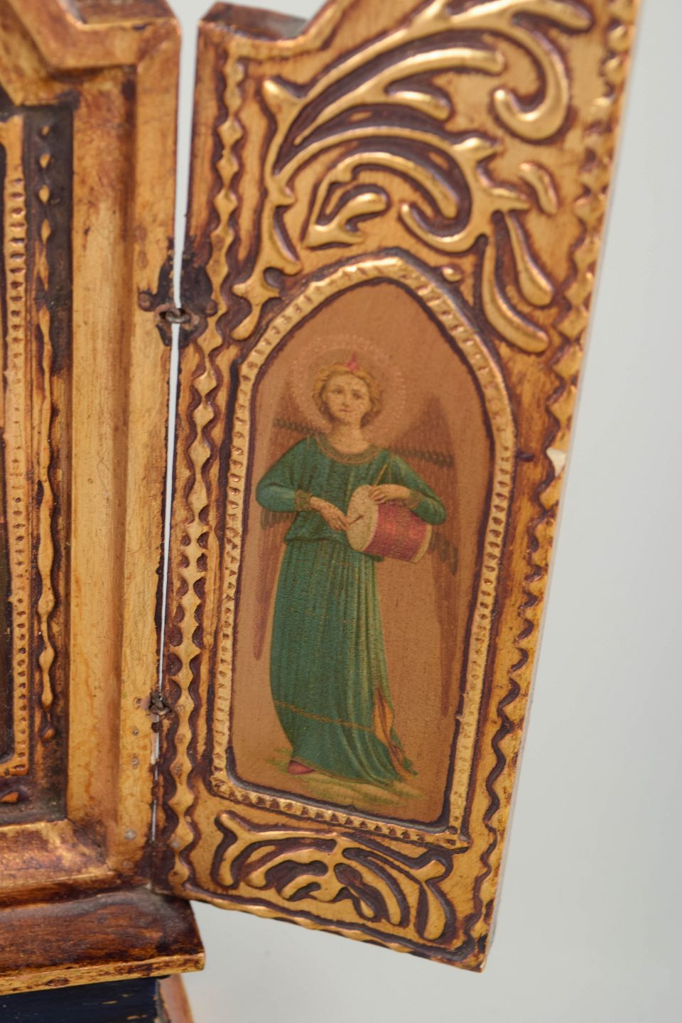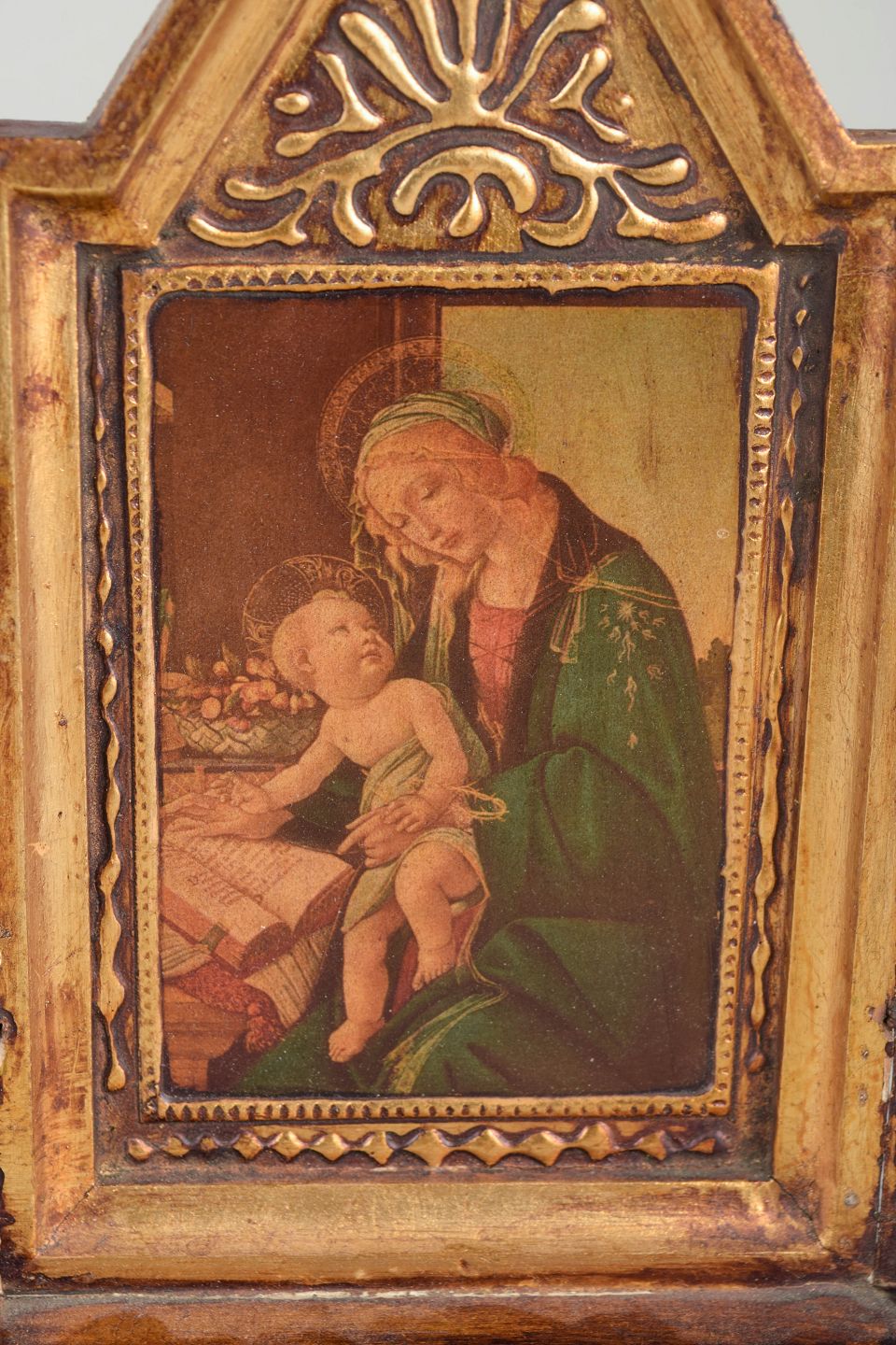 Foldbart triptykon med centralt ikonmotiv af Madonna med Barn, flankeret af helgenfigurer på sidefløjene. Udført som maleri på træ med forgyldt og ornamenteret ramme.