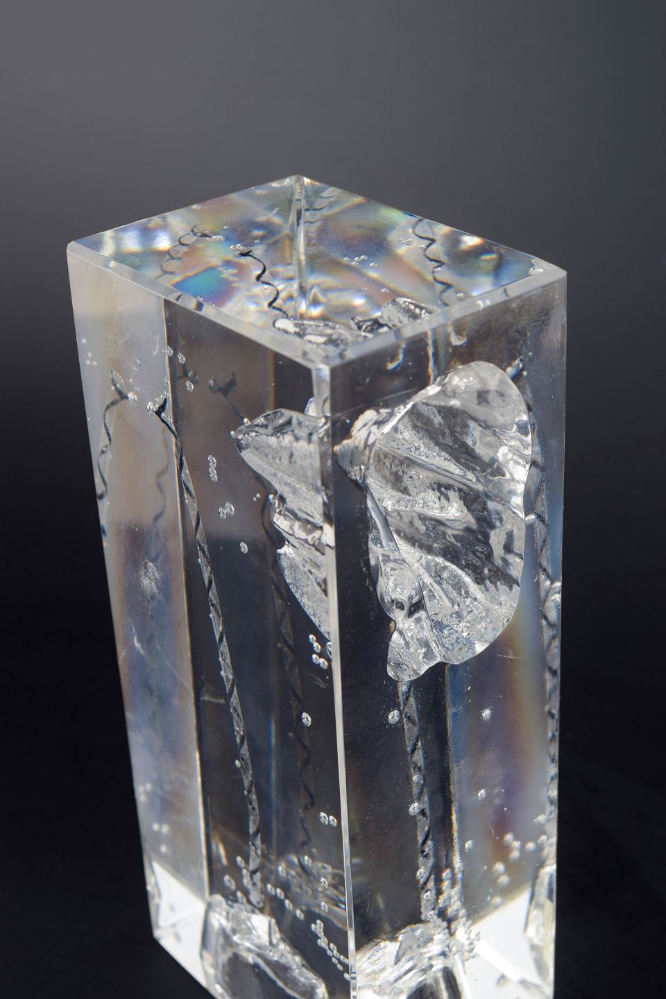 Rektangulær, massiv kunstglasskulptur med indkapslet figurativt motiv og indsmeltede luftbobler, udført i klart glas med indre strukturer og optiske brydninger. Original Kosta Boda-klistermærke.