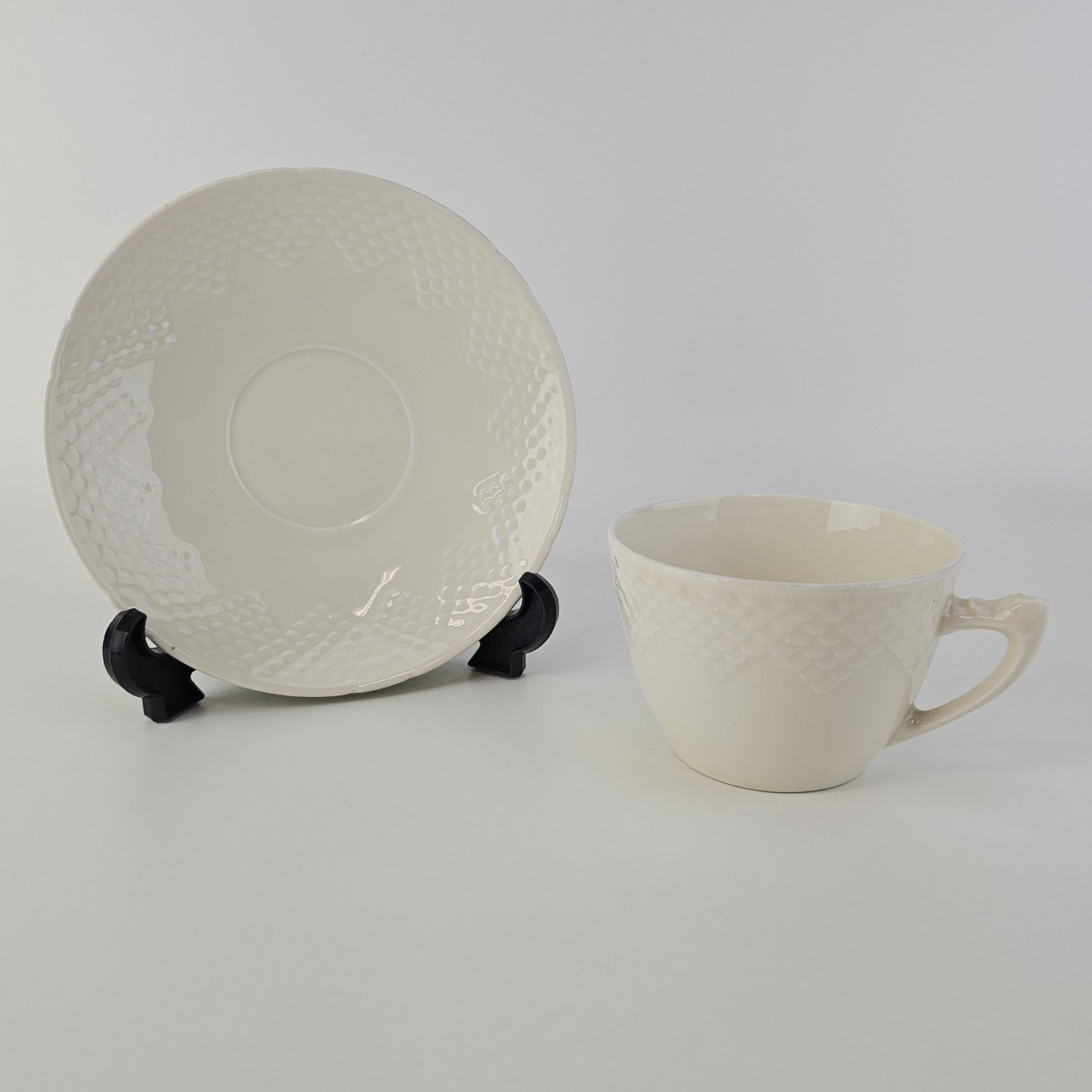 Elegance er cremefarvet glaseret porcelæn med skæl mønster