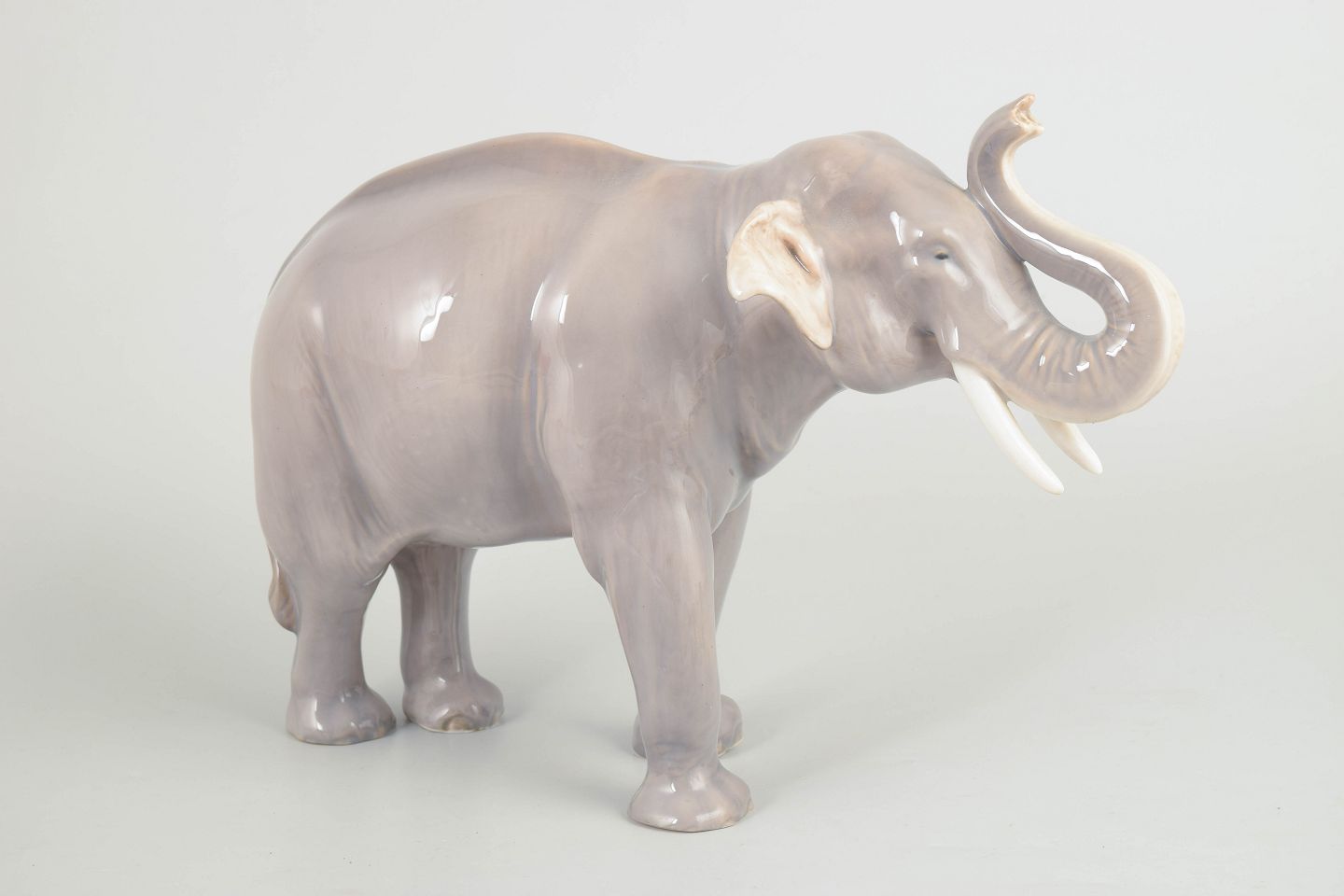 Naturalistisk modelleret elefantfigur i glaseret porcelæn, model 1373, med løftet snabel og detaljeret gengivelse af hud og proportioner.