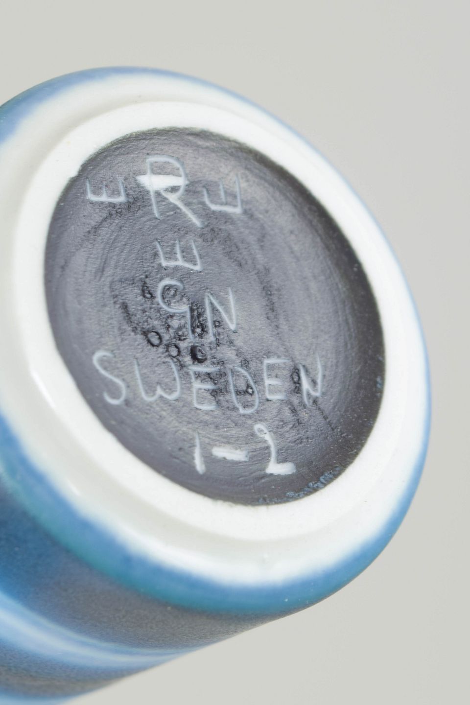 Slank miniaturevase i drejet stentøj med horisontale bånd i blå og hvide nuancer, udført i Nylunds karakteristiske glasurarbejde.
