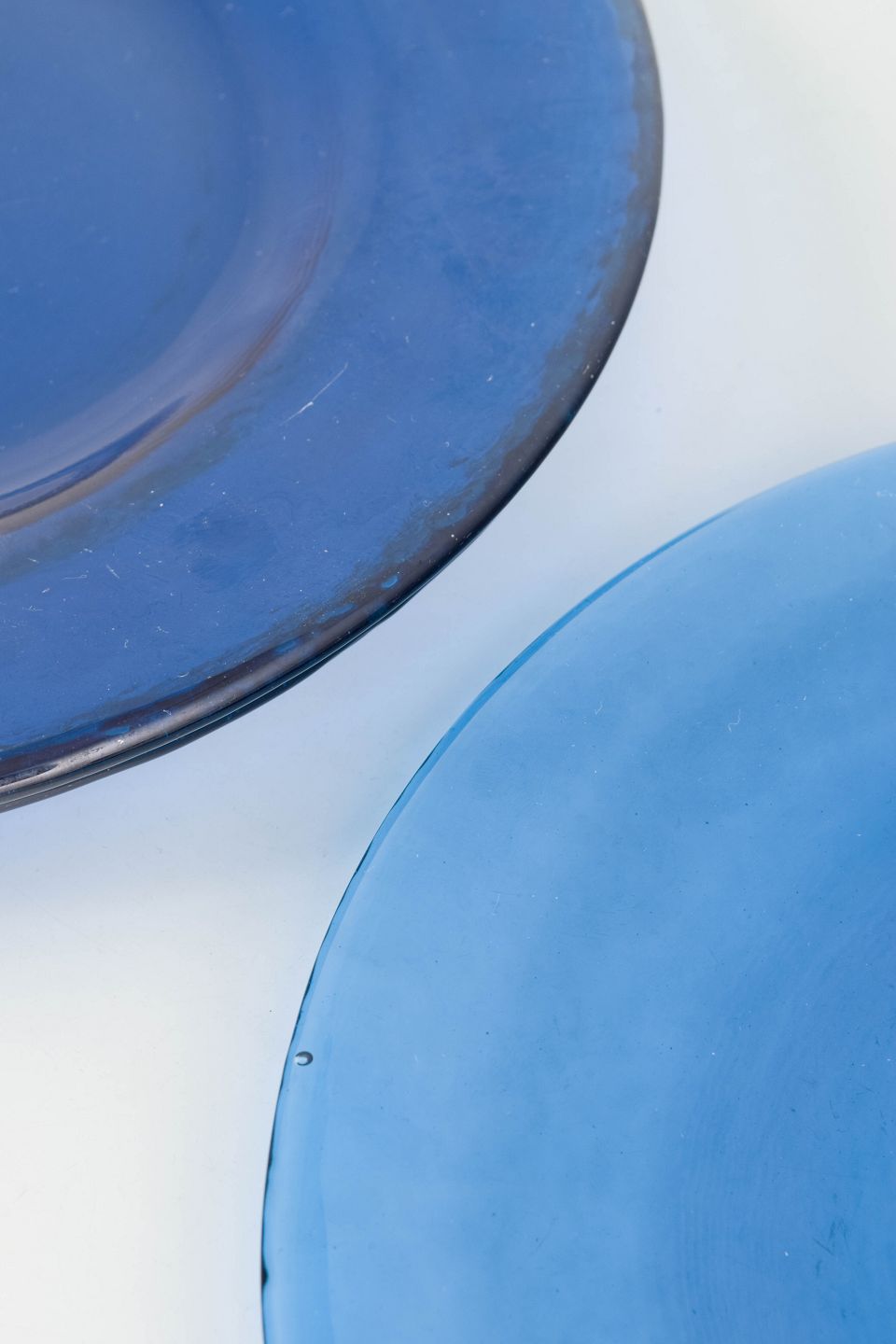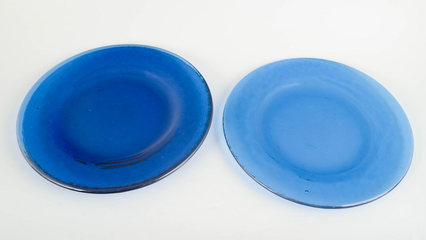Sæt med tre svenske tallerkener i kraftigt blæst kunstglas i blå nuancer, udført med glat spejl og let ujævn rand, typisk for skandinavisk glasdesign fra midten af det 20. århundrede.