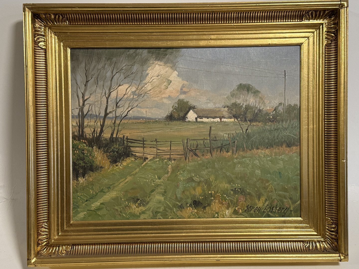 Søren Edsberg (f. 1945 ), Oliemaleri på lærred med motiv fra landet, Mål med ramme: 53x43cm, lille fejl på rammen ellers pæn stand