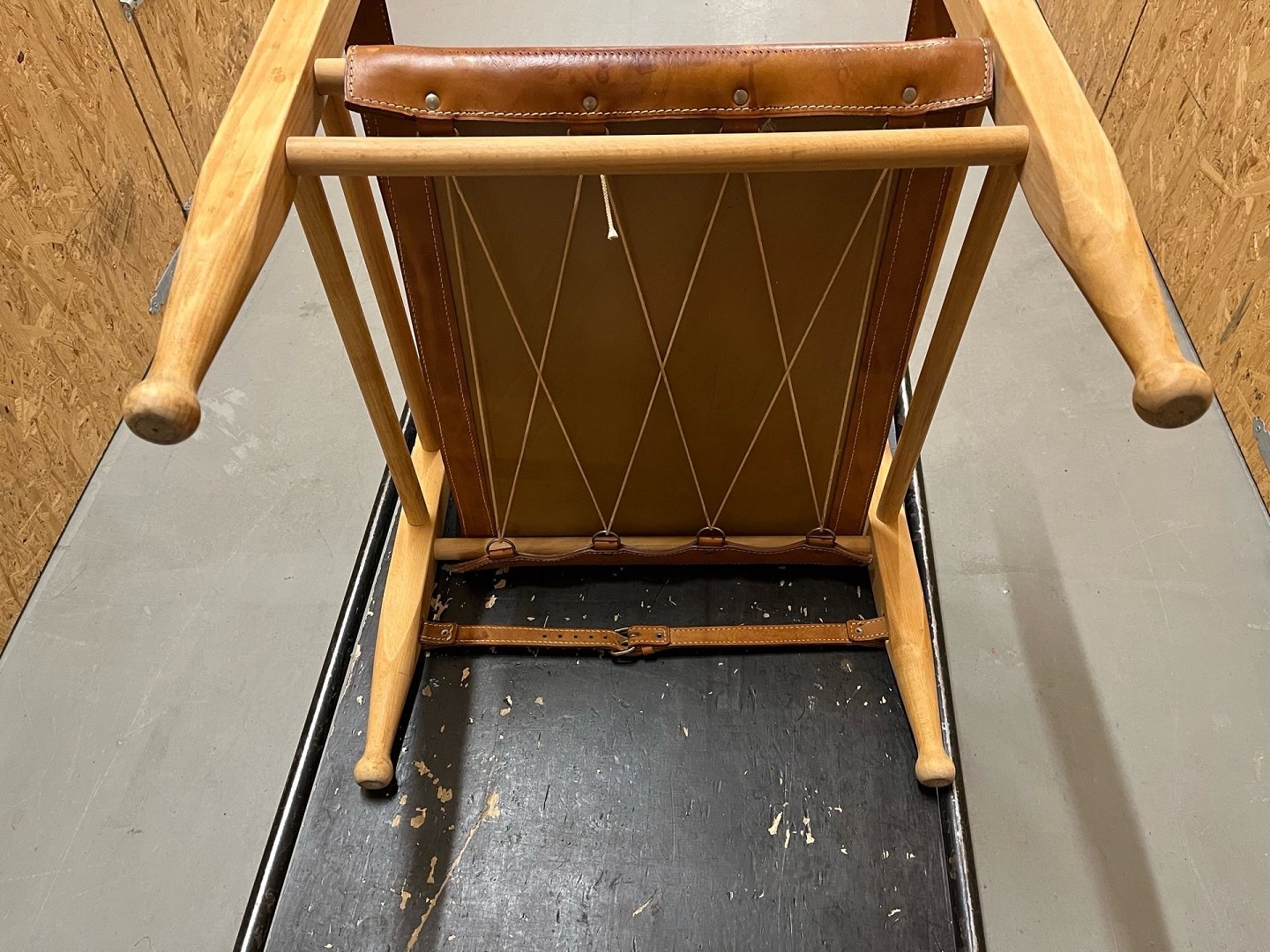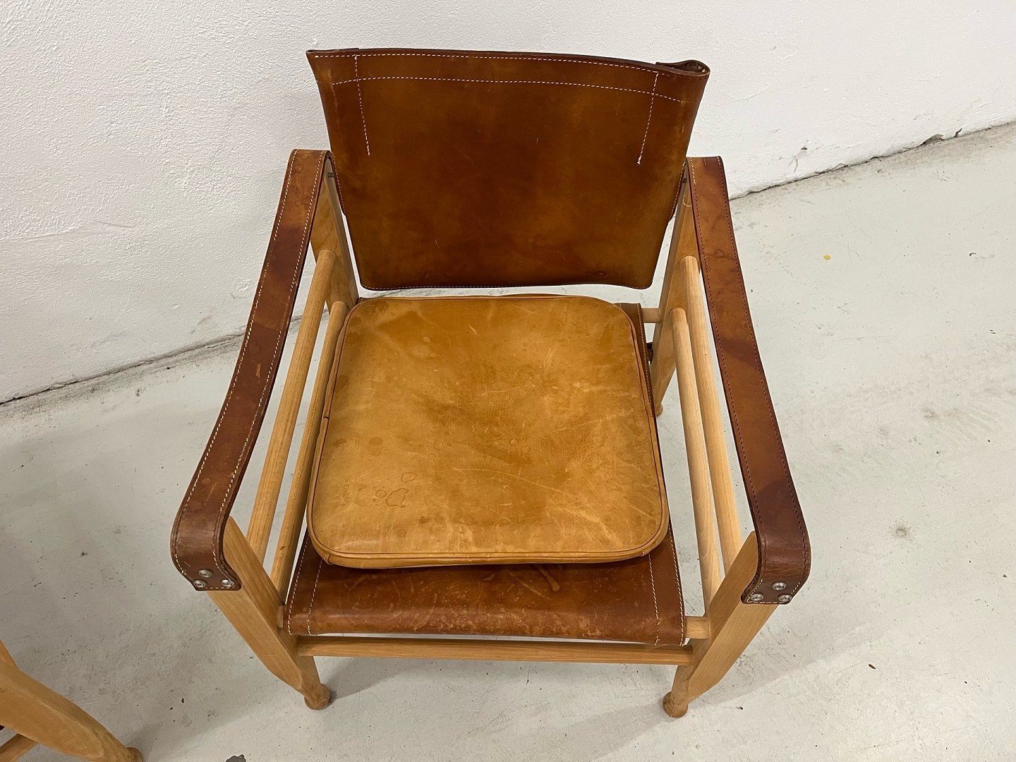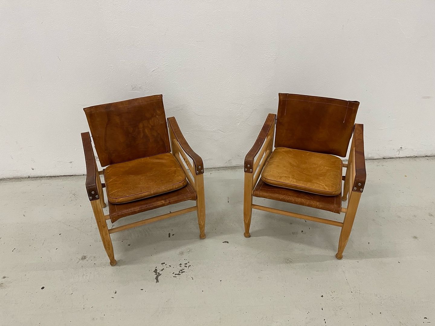 Et helt unikt og særdeles velbevaret sæt safaristole designet af Aage Bruun & Søn fra 1960’erne. Stolene er udført med stel i massivt bøgetræ samt sæde, ryg og armlæn i cognacfarvet, patineret kernelæder. Læderet fremstår smukt patineret, og både spænder, stropper og stel er i fuldstændig original og fejlfri stand.