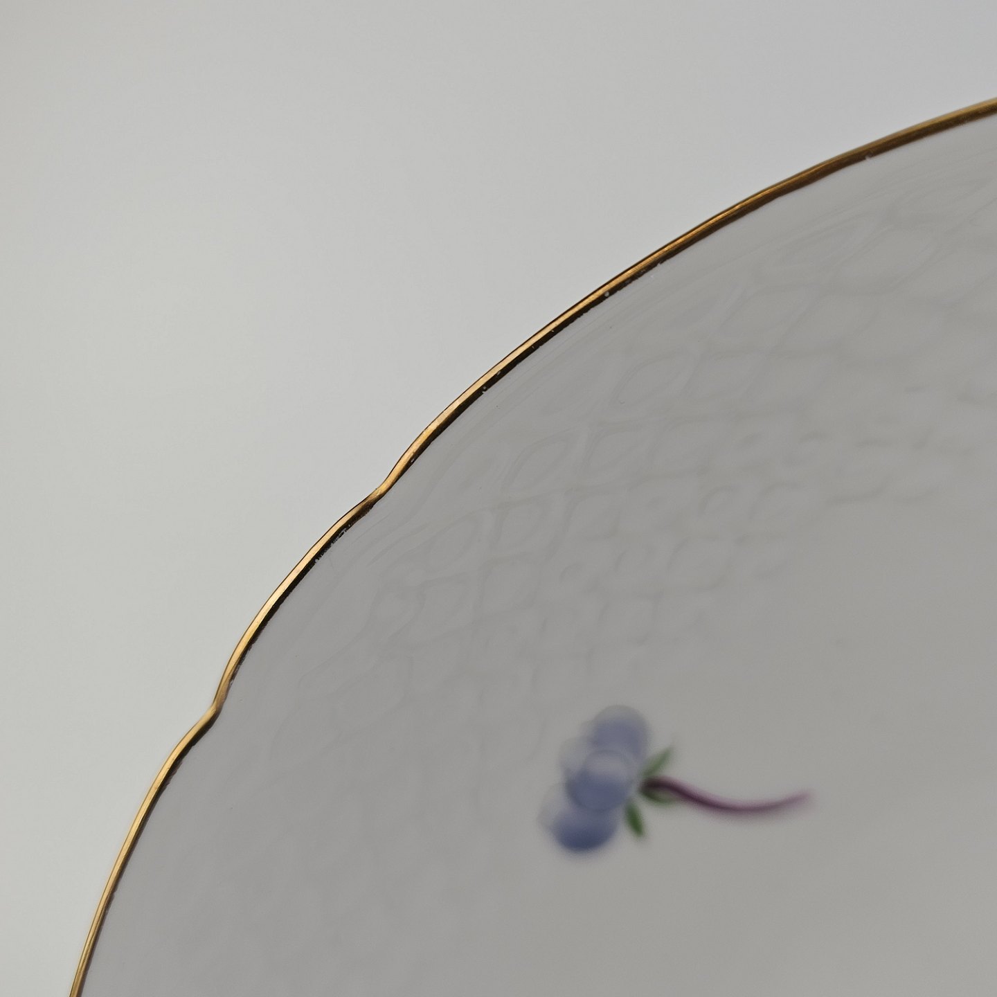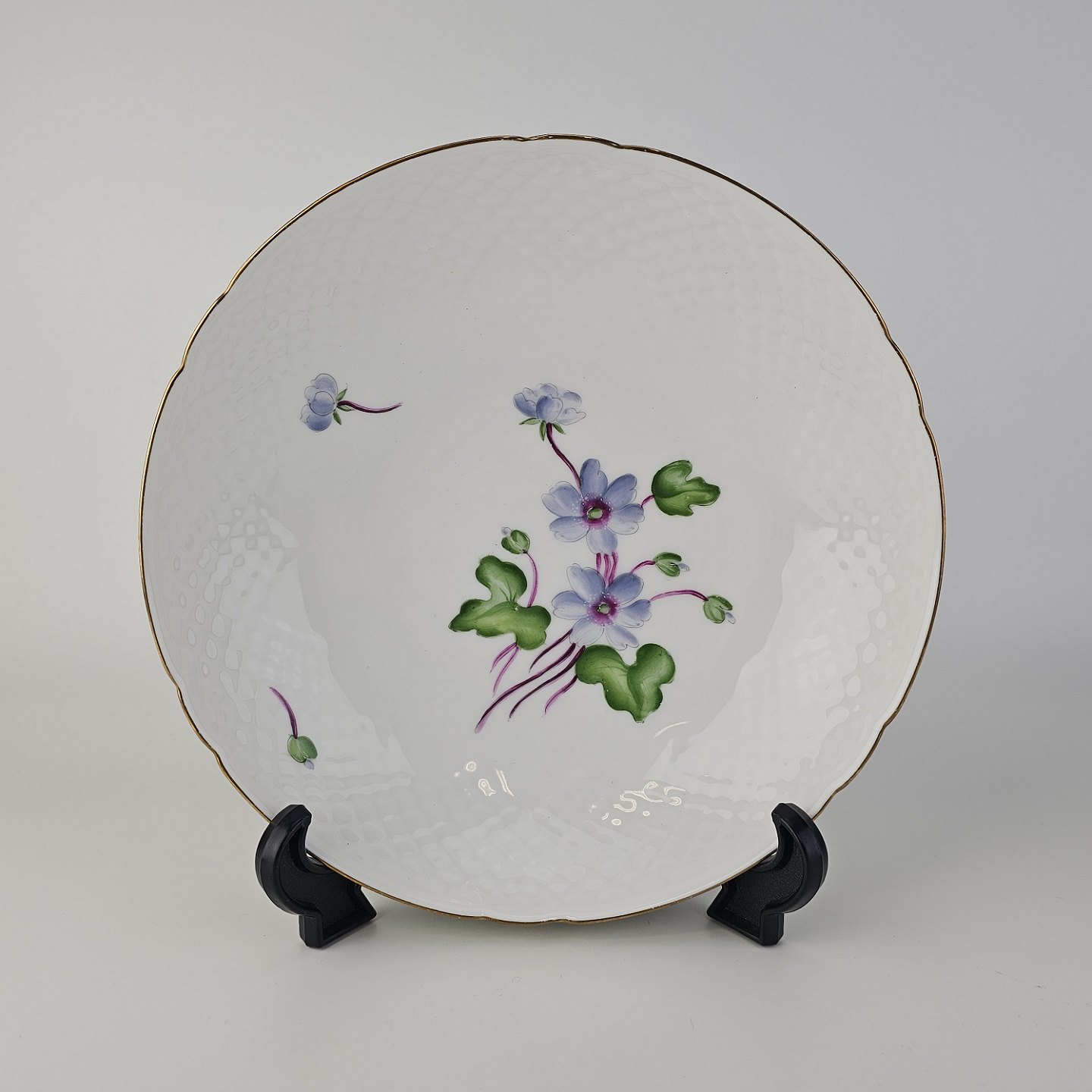 Antonius er af hvidt porcelæn med skælform dekoreret med håndmalede blå anemoner og guldkant. Også kendt under navnet Blå Anemone.