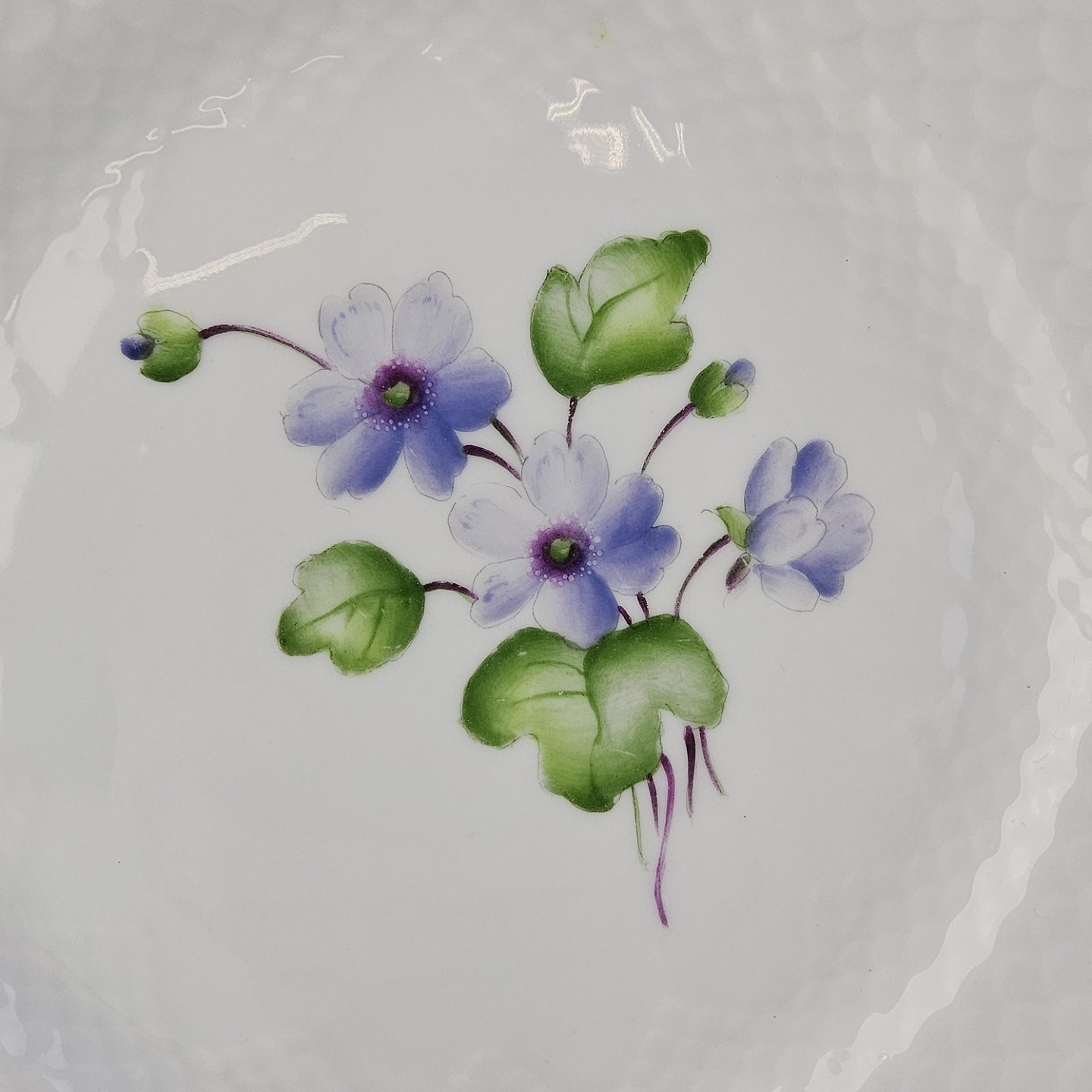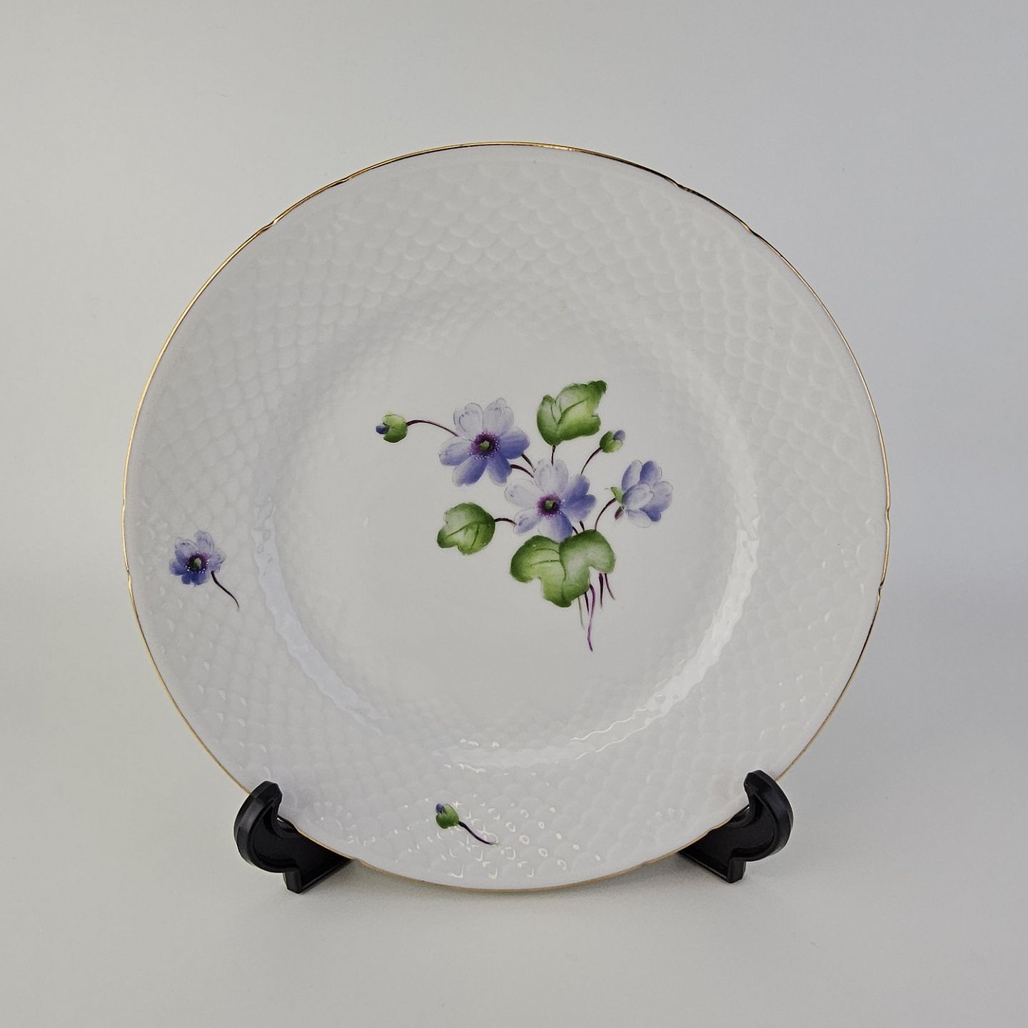 Antonius er af hvidt porcelæn med skælform dekoreret med håndmalede blå anemoner og guldkant. Også kendt under navnet Blå Anemone.