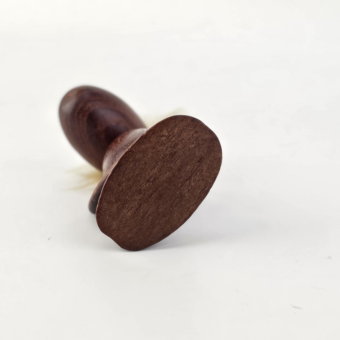Håndskåret figur af teak med blond hår og arme af læder. Fra 1960'erne