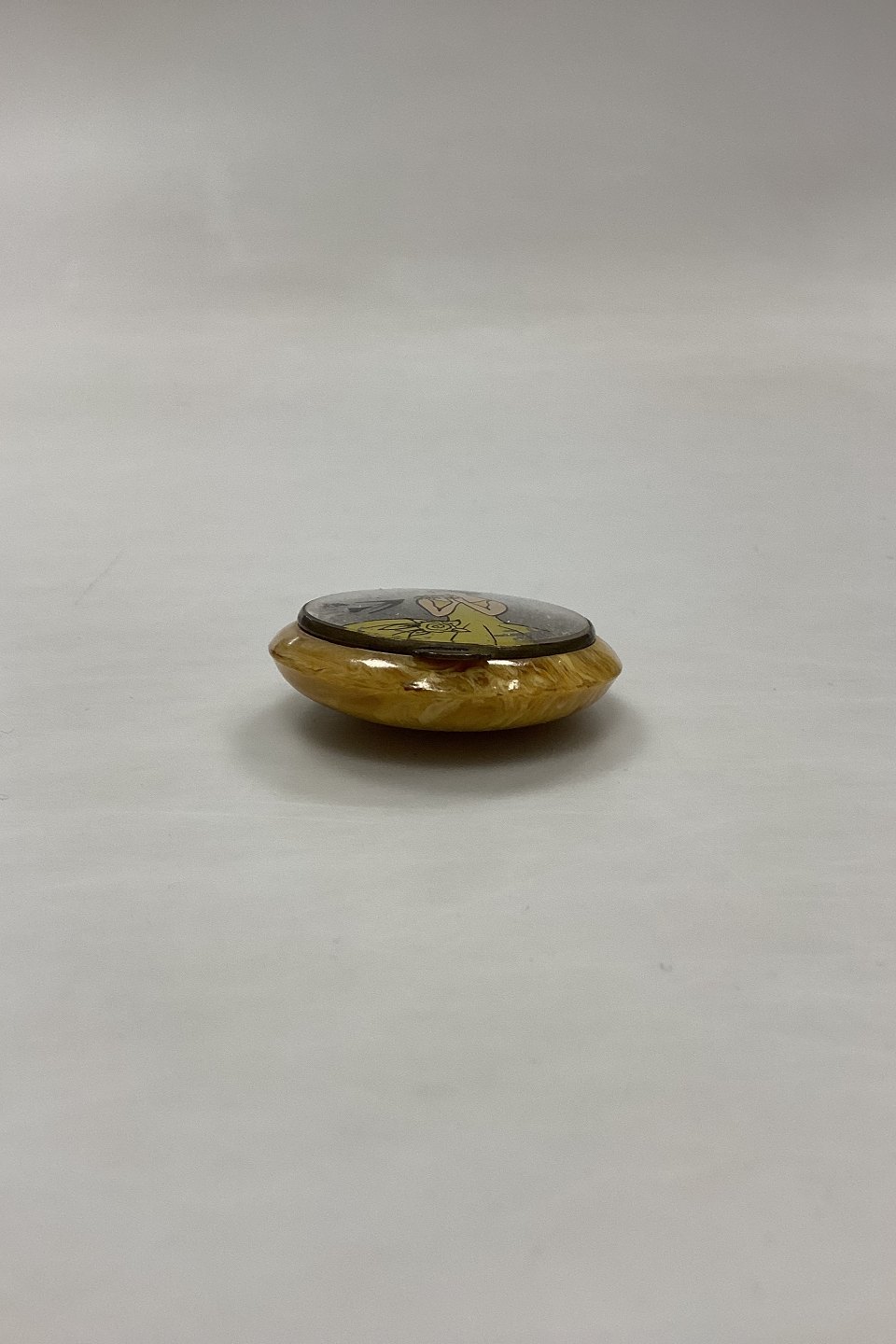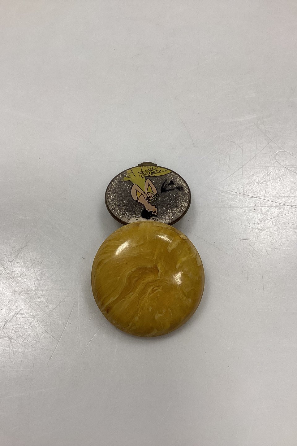 Art Deco Pilleæske med Spejl. Formentlig bakelit i gul marmorering. Motiv med kvinde i gul kjole på baggrund af sølvglitter.