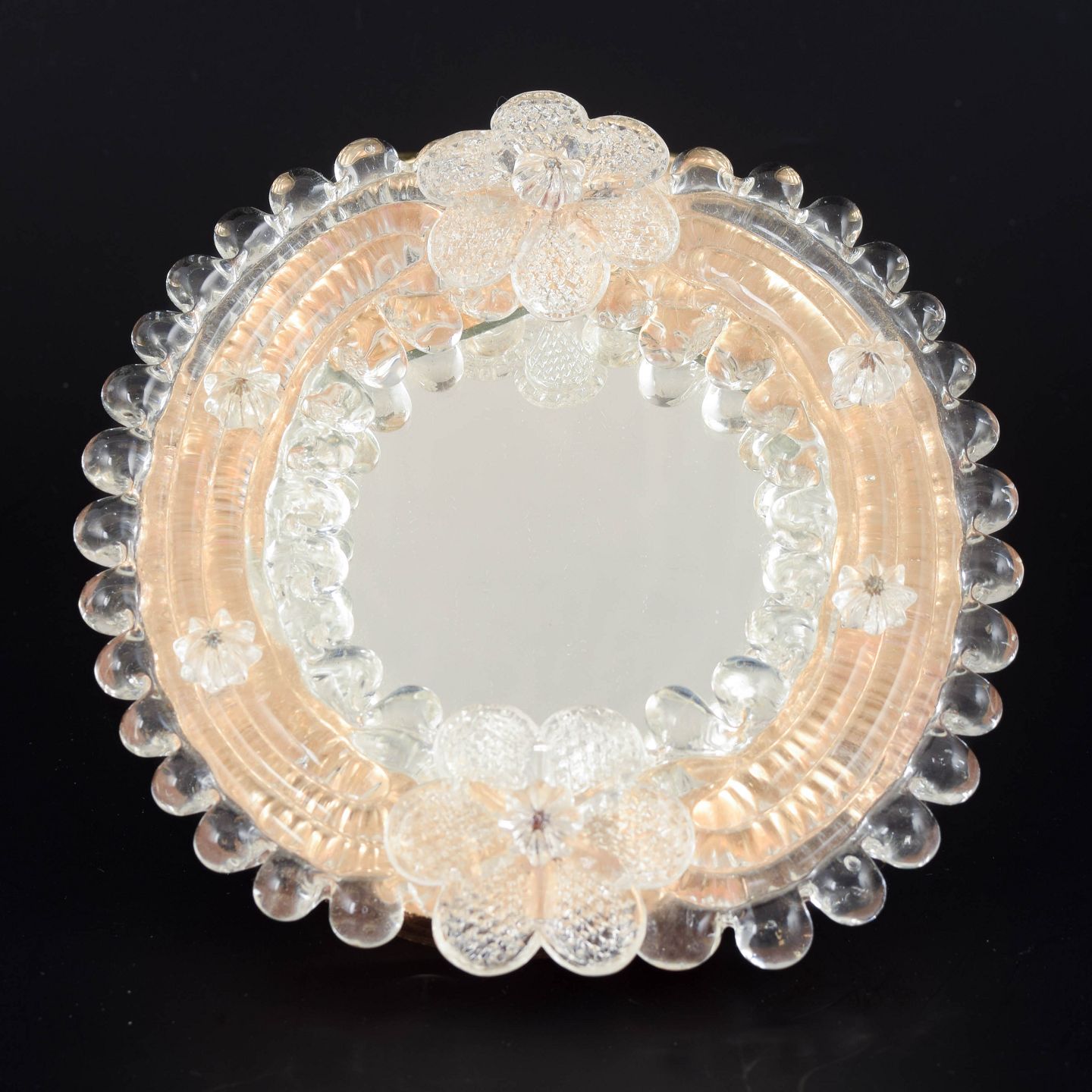 Lille dekorativt vægspejl med ramme af håndformet Murano-glas i varme rosétoner og klart glas. Rammen er opbygget af påsatte blomster- og knopformer med rillet og boblet struktur, typisk for venetiansk glasdesign fra midten af det 20. århundrede. Spejlglasset er indfældet centralt i den plastiske glasramme.