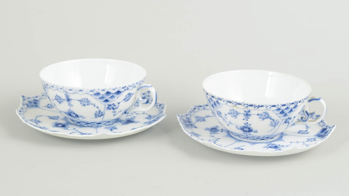 Royal Copenhagen, Blue Fluted Full Lace tea cups with saucers, set of 2.
