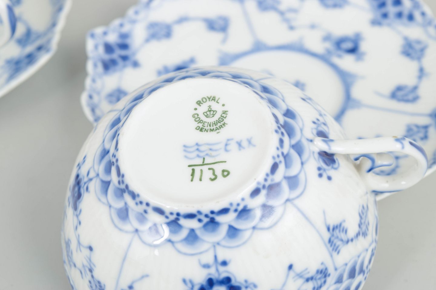 Two tea cups with matching saucers in hand-painted underglaze cobalt blue decoration in the Blue Fluted Full Lace pattern, featuring pierced lacework along the rim. Cup and saucer model 1/1130. Cancelled with one and two incised lines.