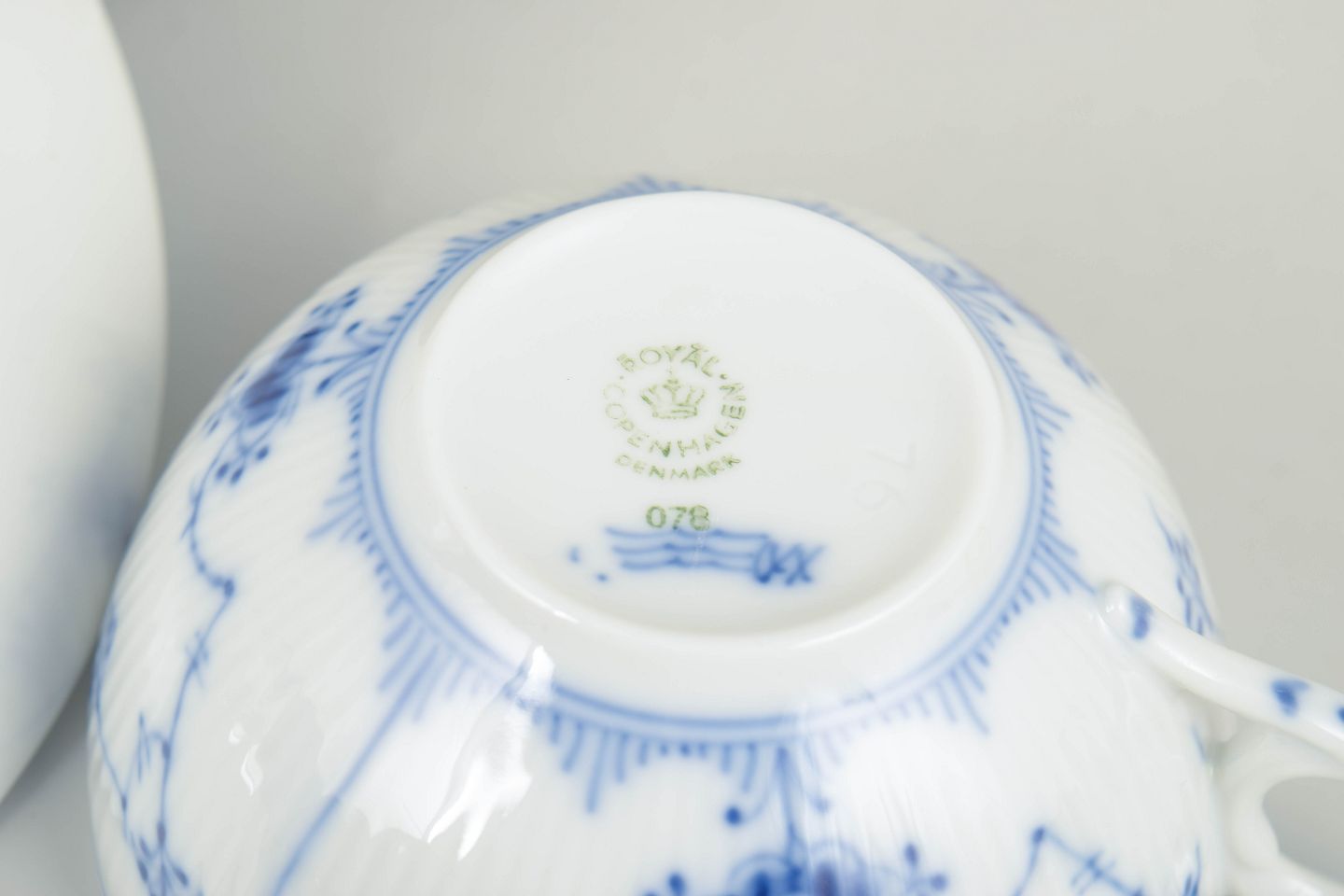Musselmalet riflet er Royal Copenhagens ældste og mest ikoniske stel, oprindeligt introduceret i 1775. Dekorationen udføres i frihåndsmalet kobolt under glasuren, hvilket giver de karakteristiske variationer i streg og farveintensitet. Stellet har været i kontinuerlig produktion i mere end to århundreder og regnes som et hovedværk i dansk porcelænshistorie.