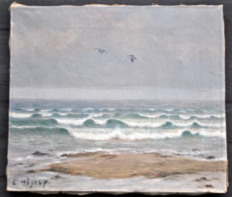 Høyrup, Carl (1893 - 1961) Danmark: To hejrer. Strandparti ved Kerteminde, 1924. Olie på lærred. Signeret: C. Höyrup. H: 33 cm. B: 38 cm. Uindrammet.