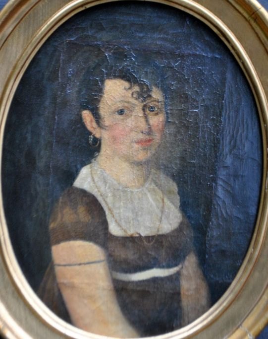 Dansk empire portrætkunstner (19. årh.): Portræt af en ung kvinde. Oval. Olie på lærred. 56 x 44 cm.