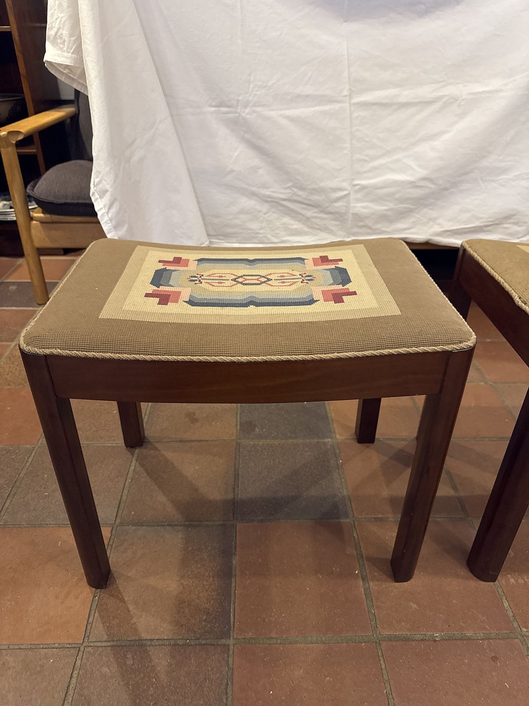 Dansk snedker et par taburetter i lakeret mahogni betrukket med stof.