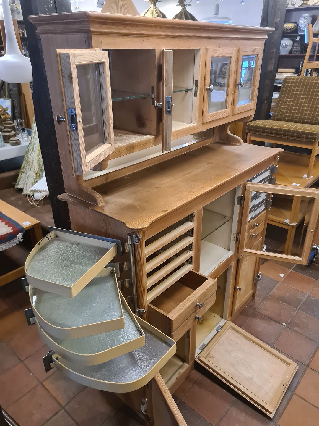 Ældre originalt tandlægeskab i fyrretræ med låger og hylder i glas og metal.