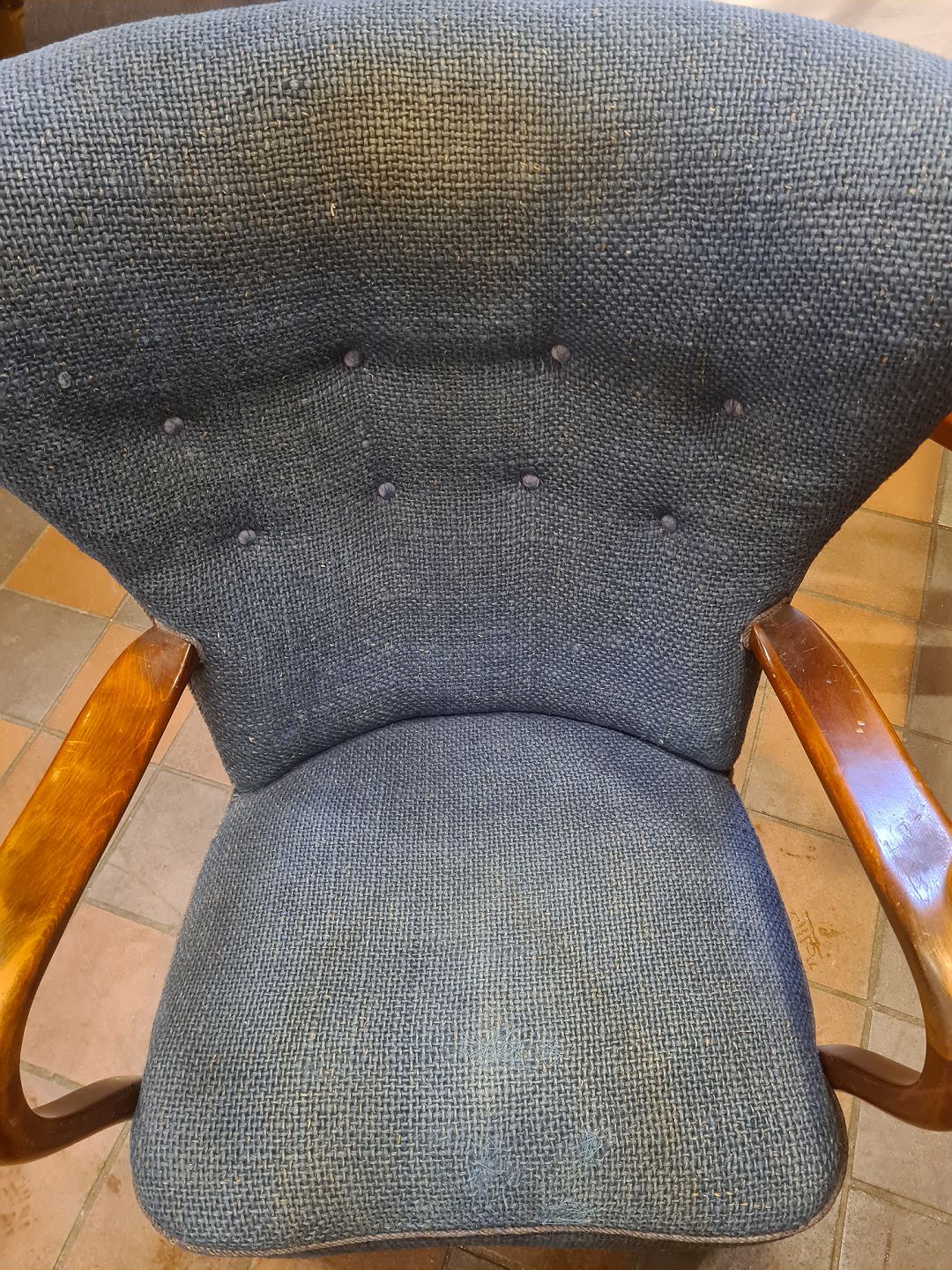 Alfred Christensen overpolstret lænestol model: 23B udført m. stel i bejdset bøg og betrukket med uld stof. Fremstillet hos Slagelse Møbelværk ca. 1950'erne.