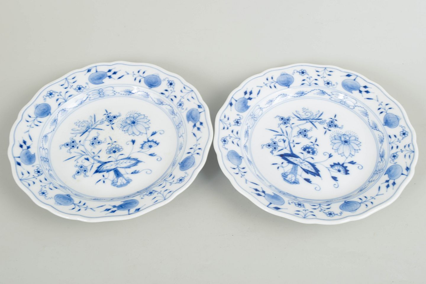 Tallerkener i porcelæn dekoreret med det klassiske blå løgmønster. Annulleret med to indridsede linjer. Mærket i bunden med Meissens krydsede sværd.