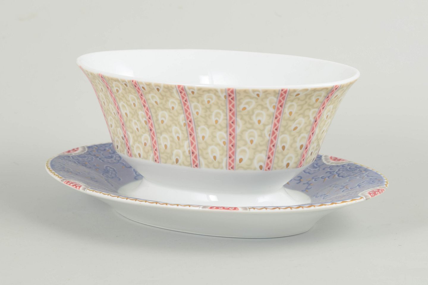 Elegant sauce boat in white porcelain decorated with the Fairytale pattern in soft pastel colours and delicate detailing. This model was produced between 1992 and 1999 and is of first factory quality.