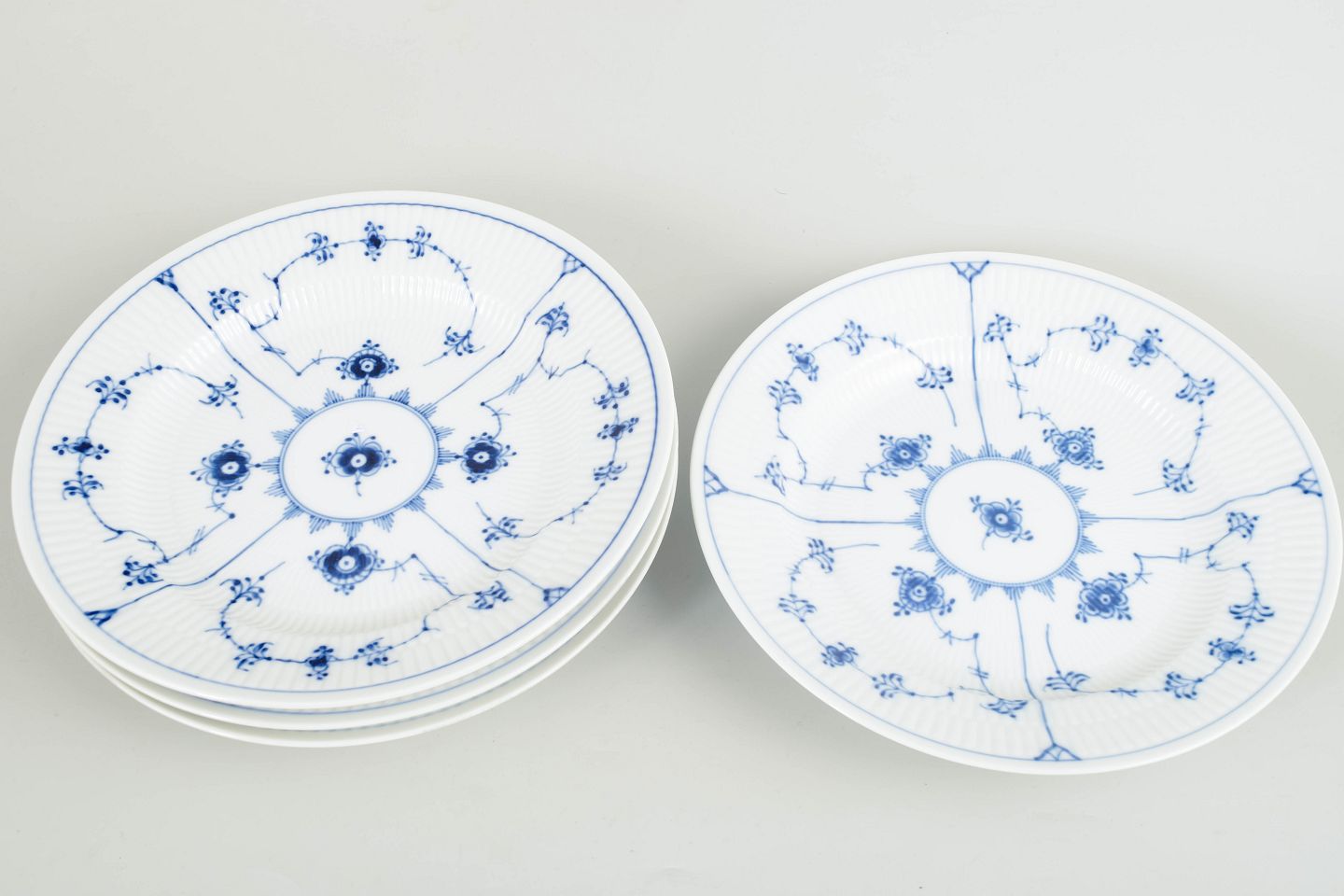 Royal Copenhagen, Musselmalet riflet, sæt på 4 middagstallerkener.