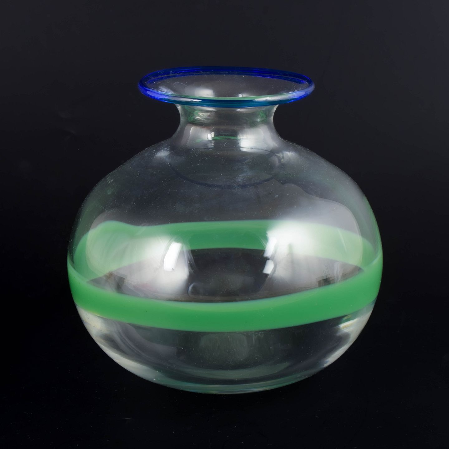 Rund, blæst kunstglasvase i klart glas med bred grøn horisontal bånddekoration og blå markeret munding.